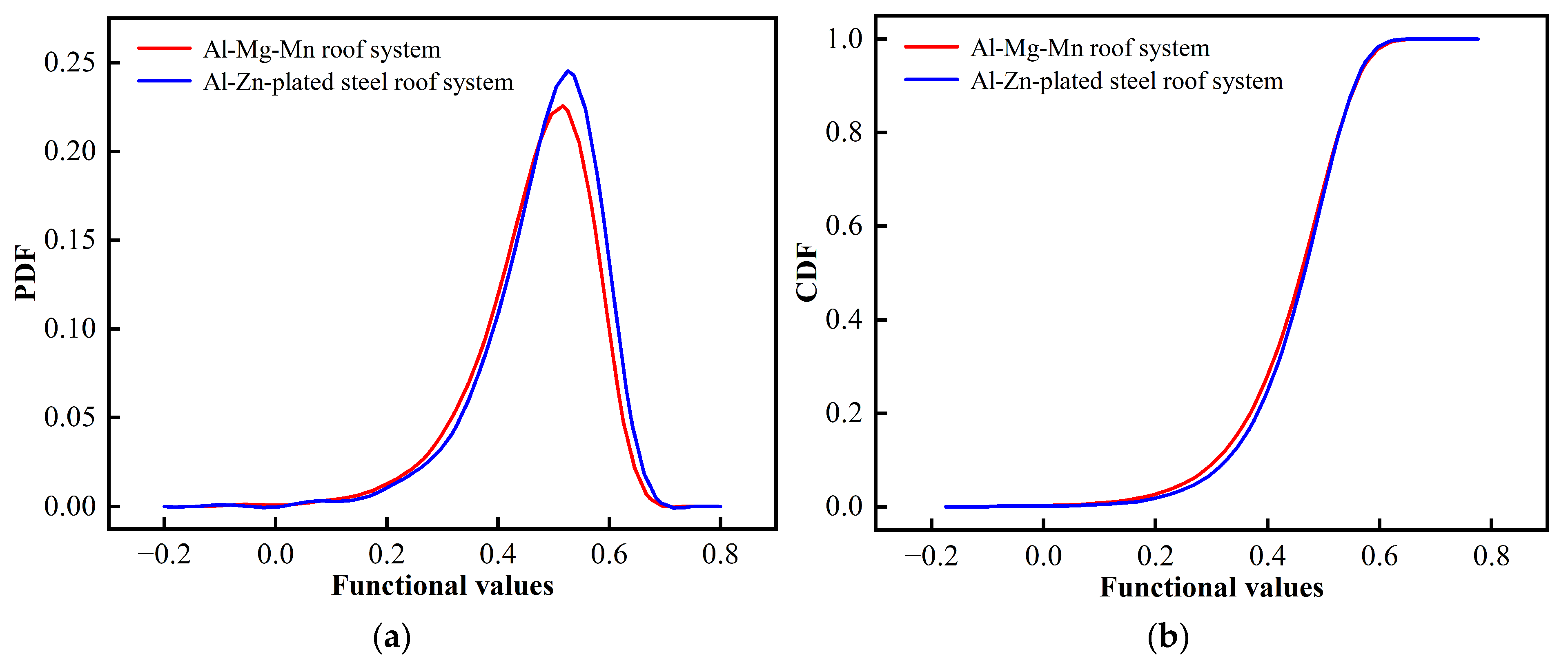 Probability density functions and cumulative distribution functions of roof systems. (a) PDF. (b) CDF.