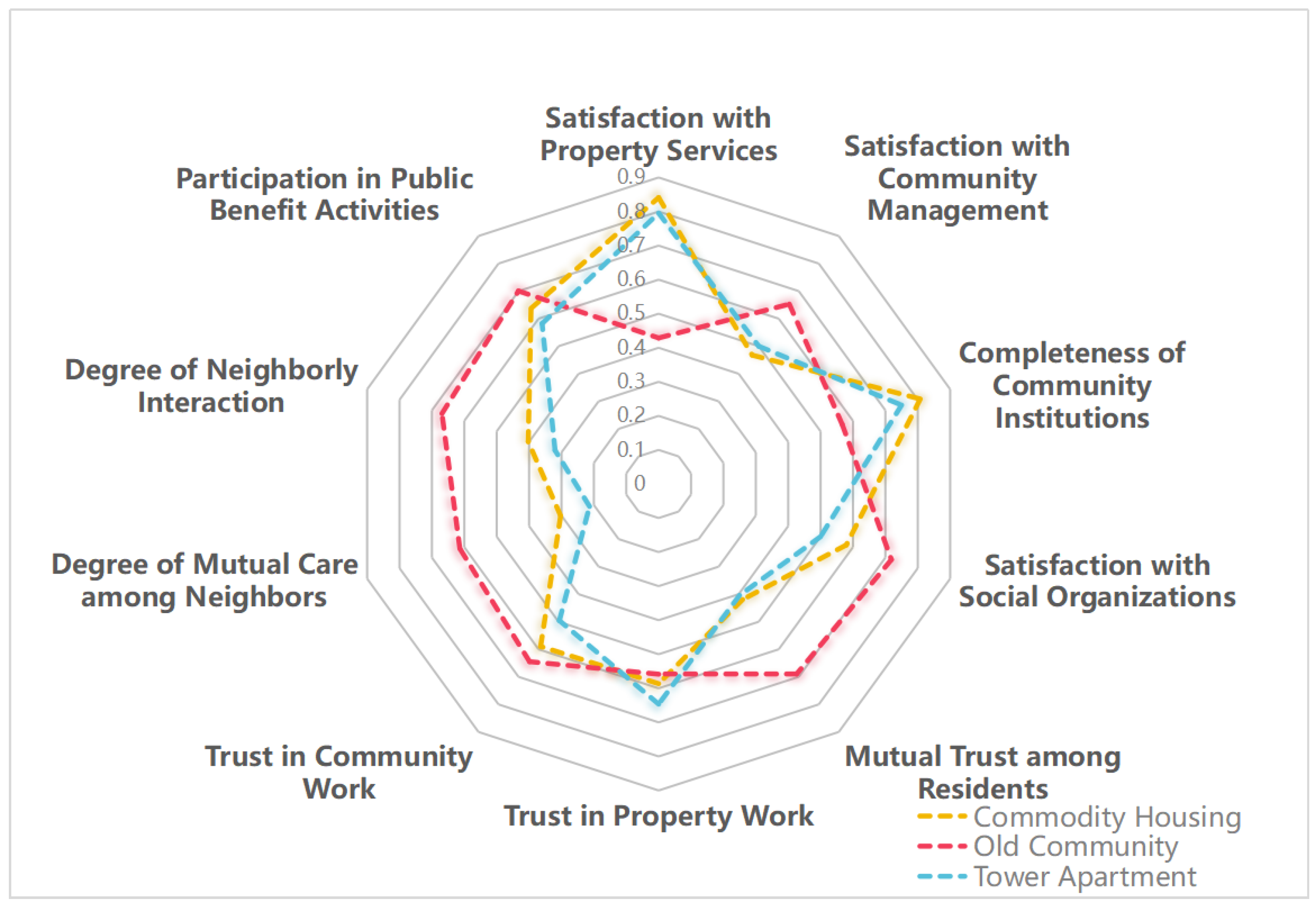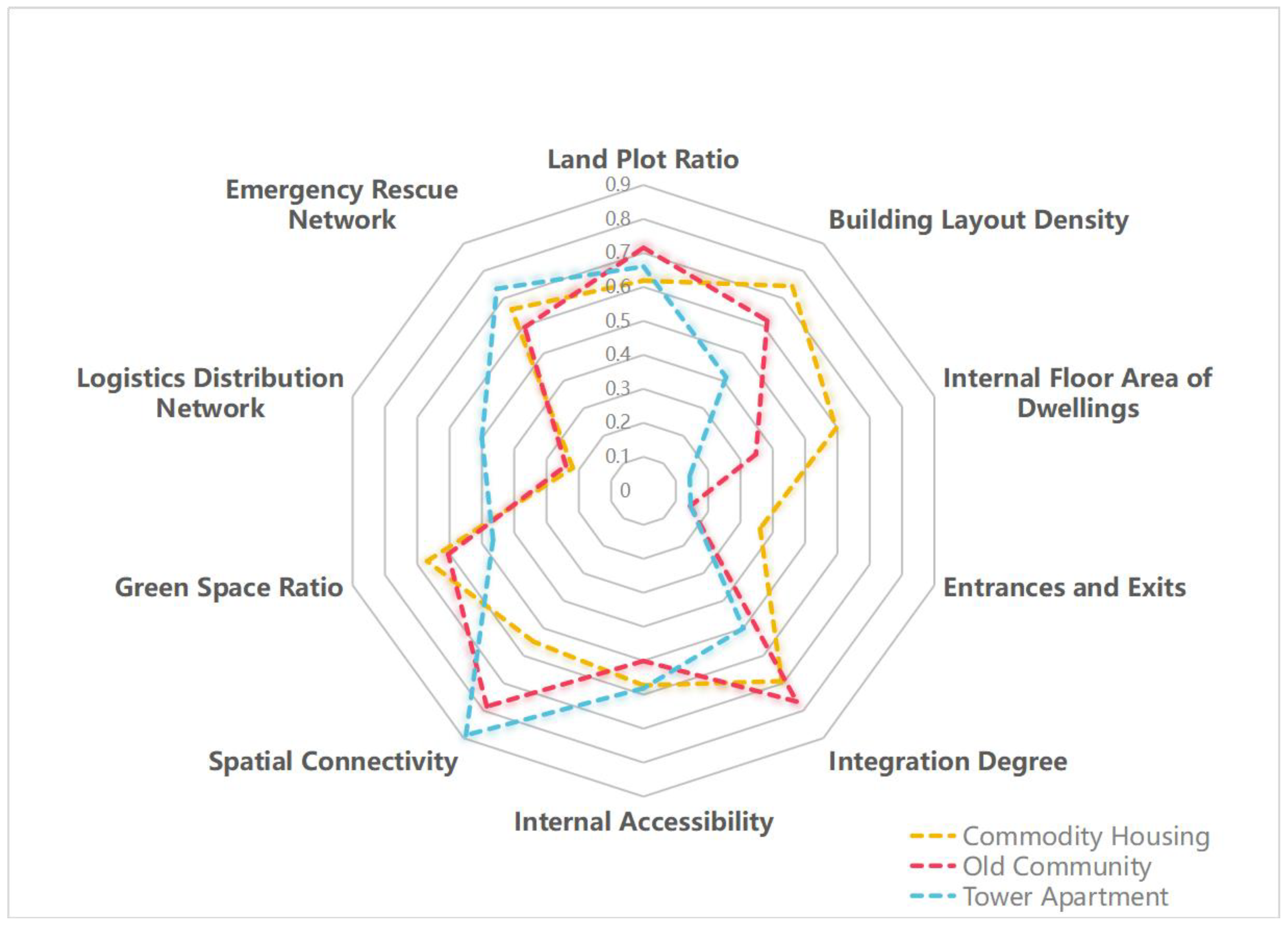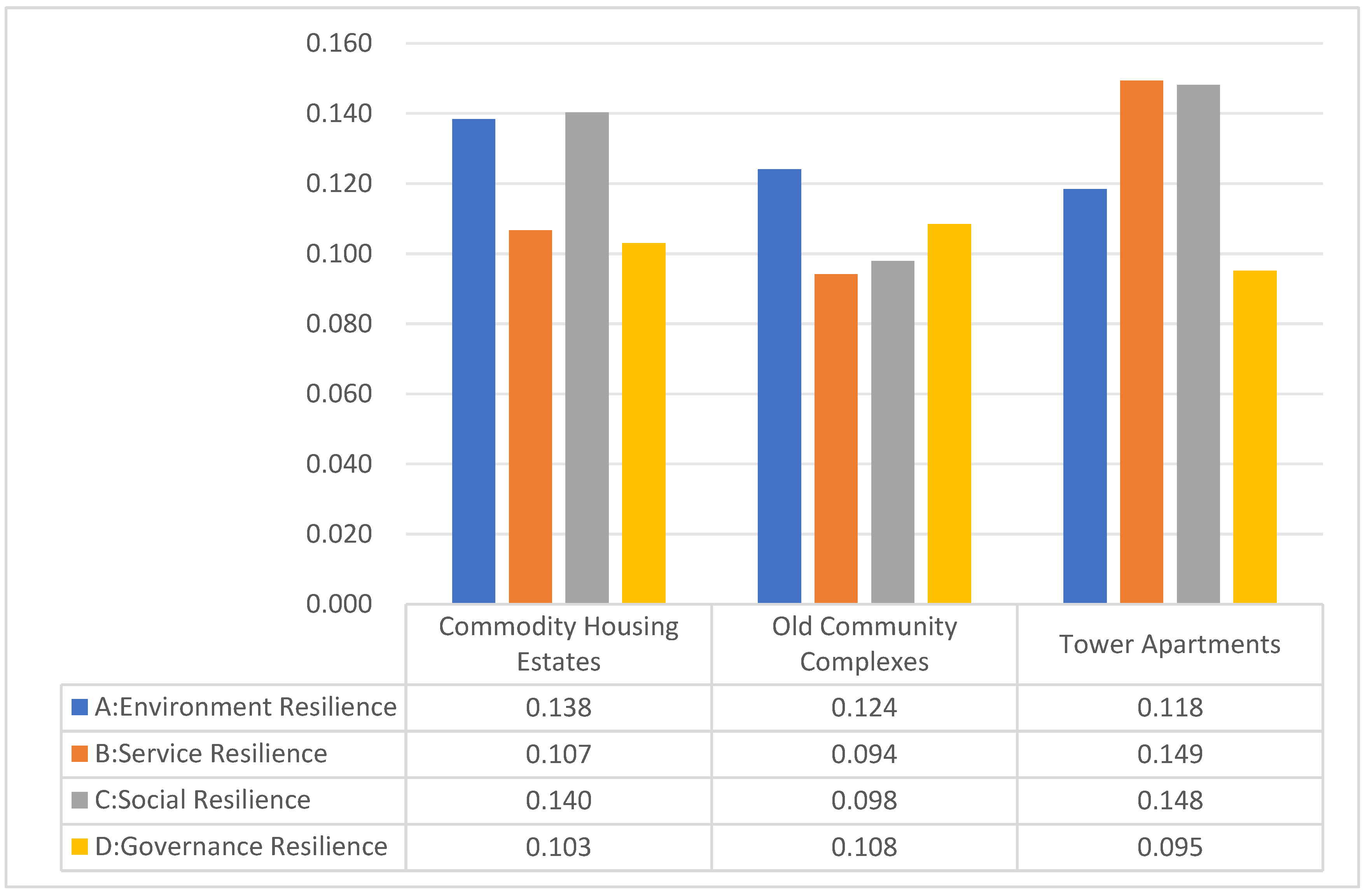 - Tower apartments: This community type exhibits the highest overall resilience (X = 0.511). Constructed mainly between the 1990s and the 2000s, these buildings were predominantly located at the heart of Tianjin. Compared to the other two community types, tower apartments generally show strong resilience in both service and social aspects. Their resilience is bolstered by the optimal utilization of nearby resources and excellent access to surrounding public services, fulfilling residents’ daily requirements. Consequently, their overall resilience was relatively robust. However, many of these structures are old and require extensive renovation and upgrades, making them a key target for future community renewal and governance efforts. The governance system is also weaker in areas such as social organizations, neighborly interactions, and public engagement.