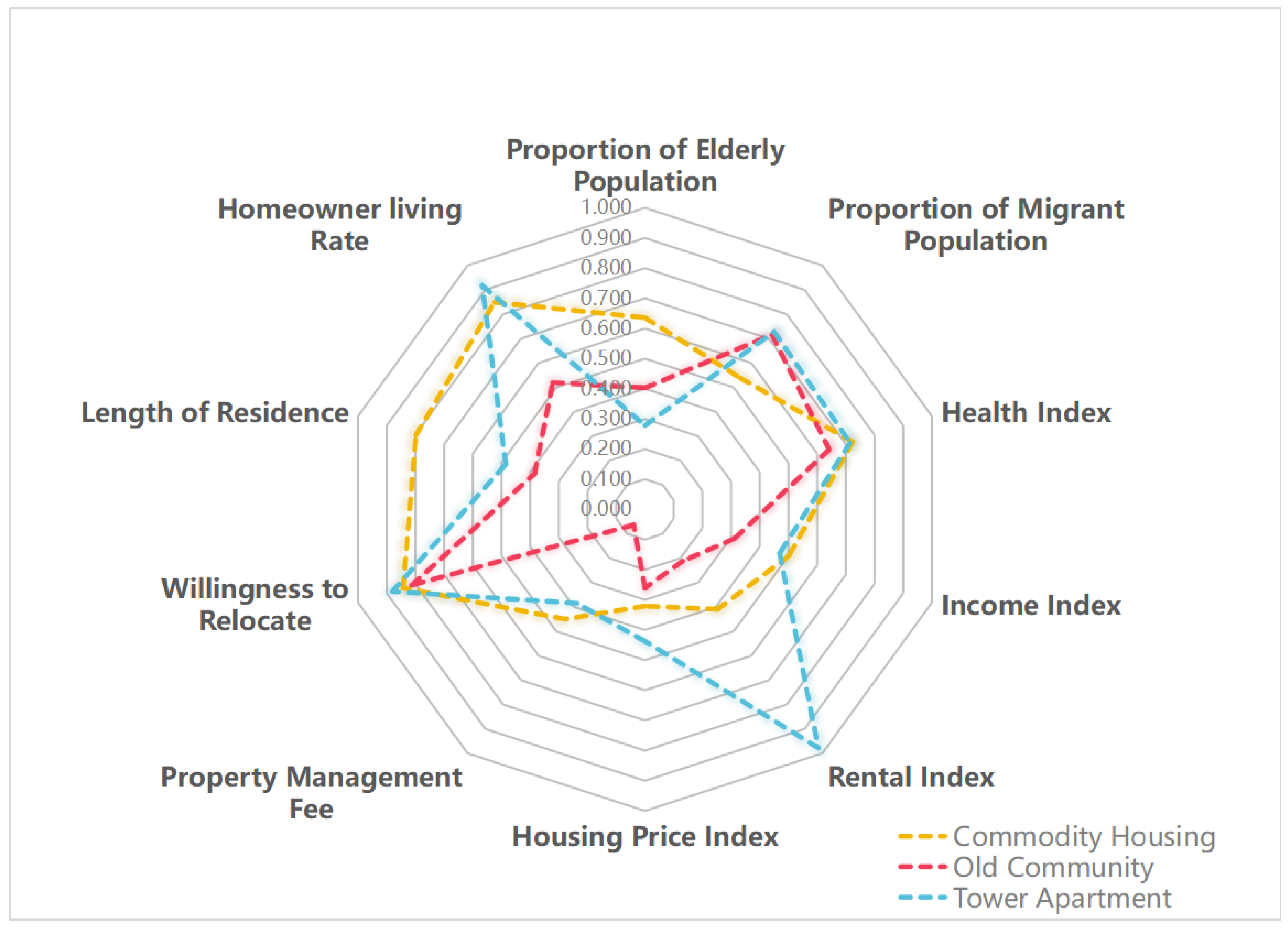 - Old residential complex (X1): These areas typically consist of housing built before the 2000s, with most constructed between the 1970s and the 1990s. Some originated from public housing projects funded by the government or work units in the previous century. Compared to complexes developed after the housing reform, these are significantly older. They mainly feature traditional multi-story buildings, are generally large in scale, and have smaller floor areas.