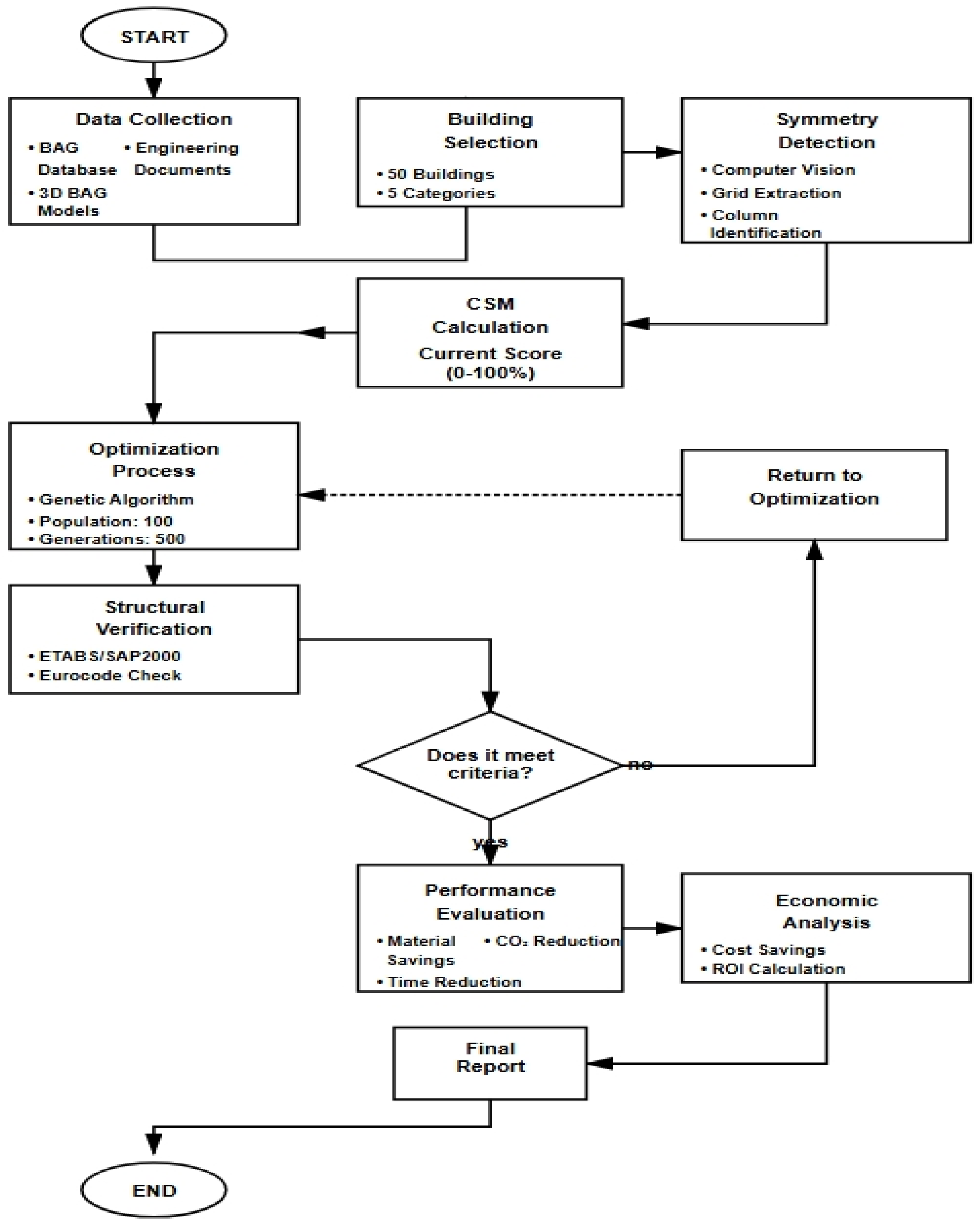 The SODA framework functions through interconnected phases that exhibit iterative refinement capabilities. The system incorporates multiple data sources, including the BAG database(Kadaster, Apeldoorn, The Netherlands), which comprises 10.8 million Dutch structures, 3D BAG(3D Geoinformation Group, Delft University of Technology, Delft, The Netherlands) models, and engineering documentation from specialist companies. The process begins with the collection of data and the selection of buildings based on structural variety, data availability, and significance. the symmetry detection phase employs computer vision techniques to achieve 94% accuracy in column identification. This is followed by grid extraction and CSM computation. The optimization technique utilizes genetic algorithms that evolve populations of 100 individuals over a maximum of 500 generations. Performance assessment evaluates material conservation, time efficiency, carbon emissions, and financial advantages, while structural verification ensures code adherence with ETABS v21/SAP2000 v23 (Computers and Structures, Inc., Walnut Creek, CA, USA)integration. The conceptual framework and the complex process hierarchy are both represented in