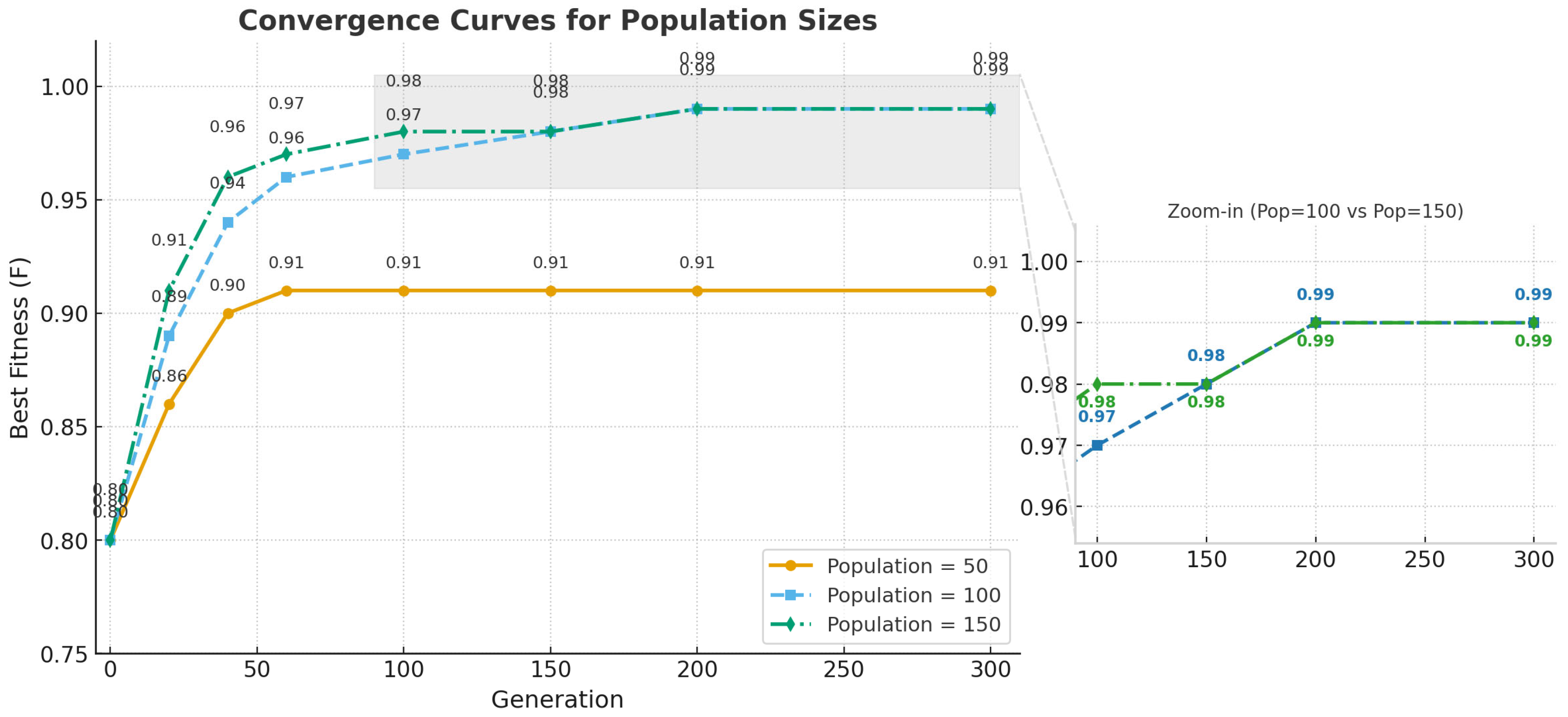 Figure 4 shows the convergence curves. Population 50 converged prematurely to fitness 0.91. Population 100 achieved 0.99 with optimal balance, while population 150 also reached 0.99 but required 58% longer computational time with minimal improvement (<0.001 difference after generation 200).
