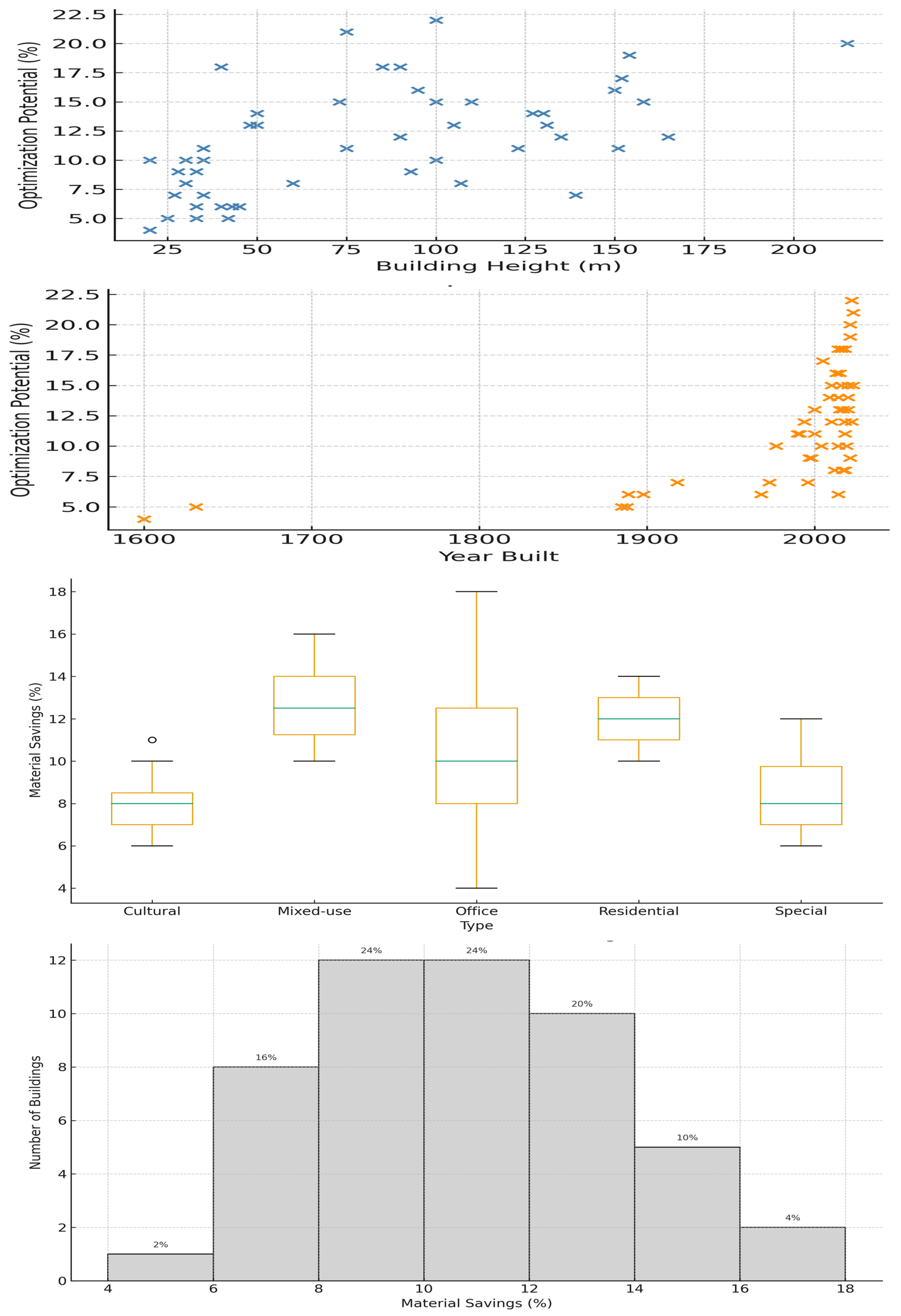 The final portfolio consisted of 10 high-rise residential buildings (73–215 m in height), 10 mixed-use complexes (40,000–160,000 m2 in area), 10 office buildings (25,000–106,000 m2 in area), 10 cultural institutions (4000–207,000 m2 in area), and 10 specialized structures, including bridges and novel designs. The total examined floor area reached 2.287 million m2, constituting approximately 0.3% of the Dutch non-residential building inventory.