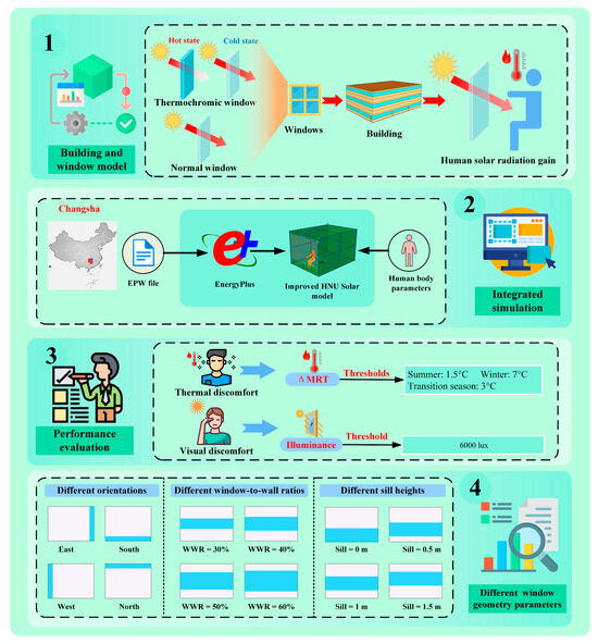 The workflow for evaluating the impact of window geometry parameters on indoor thermal and visual comfort of thermochromic windows in office buildings is depicted in Figure 1. First, two window models, namely normal window and thermochromic window, were developed using Window 7.8 [45] to obtain the detailed optical and thermal properties, including the U-value and solar transmittance (Section 2.2). These models were then entered into an EnergyPlus-based building model [46] (Section 2.3), with the meteorological data of Changsha. The improved HNU Solar model [47] was also adopted to calculate the increase in mean radiant temperature of indoor occupants caused by solar radiation (ΔMRT), which is then used to calculate the solar-induced thermal discomfort period using the seasonal solar intensity thresholds for maintaining human comfort [48] (Section 2.4). Simultaneously, the indoor daylight illuminance was also simulated and obtained via EnergyPlus [46] to quantify the over-illumination time period caused by solar radiation (Section 2.5). Moreover, a series of simulation cases was set up to explore the impact of window geometry parameters on thermochromic windows’ solar-induced thermal and visual comfort. Specifically, four window orientations (east, south, west, and north), four WWRs (30%, 40%, 50%, and 60%), and four sill heights (0, 0.5, 1.0, and 1.5 m) were investigated through comparative analyses (Section 2.6), to quantify the effects of window geometry parameters. Finally, the ranges of window geometry parameters for properly evaluating thermochromic window performance were identified.