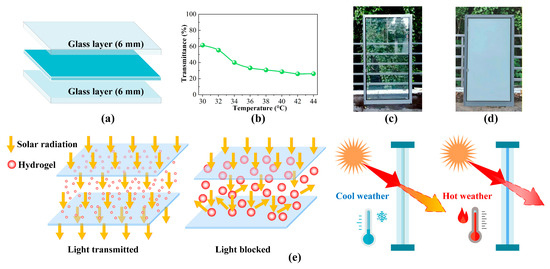 The thermochromic window employed in this study consists of two layers of 6 mm glass with a 2 mm cement adhesive layer sandwiched inside, and its structure is illustrated in Figure 2a. Its transmittance increases from 26.2% to 61.7% as its temperature falls from 44 to 30 °C (see Figure 2b). The visual appearance of the thermochromic window in both cold and hot states is shown in Figure 2c,d. The color-changing material utilized in this thermochromic window is thermochromic polyacrylamide. Its color-changing mechanism is shown in Figure 2e, with the detailed descriptions available in Ref. [43].