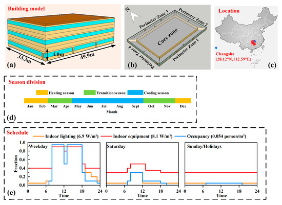 An EnergyPlus model simulating an office building was employed in this study, with each floor measuring 4.0 m × 49.9 m × 33.3 m (height × length × width), as shown in Figure 3a. Each floor comprises five zones, with each perimeter zone having a depth of 4.6 m, as shown in Figure 3b. The building is assumed as being in Changsha, China (see Figure 3c), and has heating, cooling, and transition seasons throughout the year (see Figure 3d). The lighting power density, indoor equipment power, and occupant density of the building are shown in Figure 3e, and their detailed operating times are given in Supplementary Section S2 with references to [43,46,47,49,50]. The detailed simulation settings are given in Supplementary Section S3.