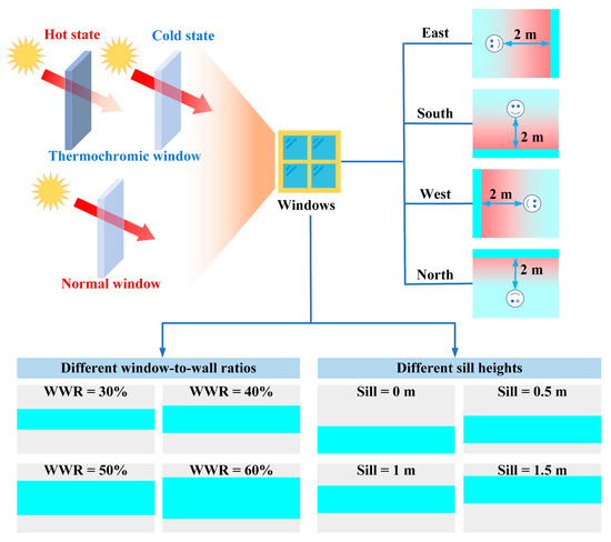 The simulations assumed that the occupant was positioned 2 m away from the window. The effect of different reference points has been discussed in our previous work [43]. In this study, the reference point located 2 m from the window was adopted, balancing the solar exposure experienced by occupants. A 10 min simulation time step provided sufficient temporal resolution to capture rapid variations in solar radiation, while avoiding excessive computational cost. Furthermore, the optical properties of the thermochromic window were measured at different temperatures, ensuring an accurate representation of its transmittance transition behavior for simulations. As shown in Figure 4, simulations and analyses were conducted on thermochromic windows with various window orientations, WWRs, and sill heights, and the detailed case information is represented in Table 1. To be specific, first, four window orientations (east, south, west, and north) were included in every case. In Cases 1–8, both thermochromic and normal windows were examined with WWRs of 30%, 40%, 50%, and 60%, while the window centerline height was fixed at 1.37 m above the floor. The effect of sill height was examined in Cases 9–16, with the WWR being fixed at 40% and the sill heights at 0, 0.5, 1.0, and 1.5 m, respectively.