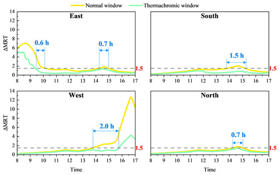 Figure 5 illustrates the ΔMRT values with normal windows and thermochromic windows on the typical day. According to the previous study of the researcher, the comfort threshold of ΔMRT in summer is 1.5 °C [54]. It is evident that thermochromic windows effectively lower the duration of thermal discomfort under different window orientations. Specifically, for the east window, thermal discomfort occurs between 8:00 and 10:00 when ΔMRT exceeds 1.5 °C, and thermochromic windows can reduce the duration by 47.1% (about 1.3 h reduced). Similarly, under the south, west, and north orientations, the periods of thermal discomfort occur from about 12:00 to 14:00, 14:00 to 17:00, and 14:00 to 15:00, respectively. The above-stated thermal discomfort durations are reduced by 100% (1.5 h), 60% (2.0 h), and 100% (0.7 h), respectively. On the whole, with normal and thermochromic windows, on a typical day, the average time ratios with thermal discomfort under four window orientations are 22.7% and 7.7%, respectively, and thermochromic windows decrease the thermal discomfort duration by 66.0% on average.