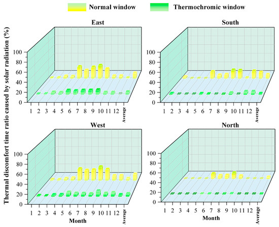 Figure 7 illustrates the monthly solar-induced thermal discomfort time ratios with two types of windows. Distinct seasonal variations are observed, with thermochromic windows providing significant mitigation in summer. Specifically, for the east window, the average monthly thermal discomfort time ratio is 11.8%, while thermochromic windows reduce it to 4.6%, with the duration of thermal discomfort being reduced by 60.9%. When the windows are in the south, west, and north orientations, the average monthly thermal discomfort time ratios are 8.7%, 13.9%, and 4.0%, respectively; with thermochromic windows, these values decrease to below 1.5%, 5.0%, and 0.1%, with the durations of thermal discomfort being reduced by 82.4%, 63.7%, and 96.4%, respectively. Overall, compared to normal windows, thermochromic windows can reduce the thermal discomfort time ratio to below 5% annually.