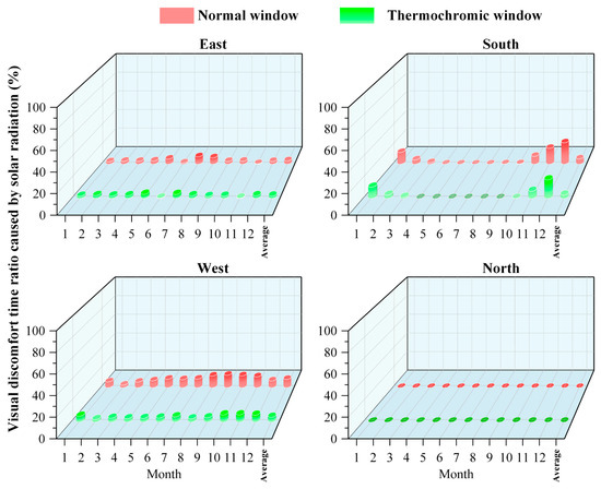 Figure 8 represents the monthly solar-induced visual discomfort time ratios with two types of windows. The results reveal clear seasonal variations across orientations, with thermochromic windows effectively reducing visual discomfort. Specifically, in the east orientation, the average monthly thermal discomfort time ratio is 3.4%, while thermochromic windows reduce it to 2.4%, with the visual discomfort duration being reduced by 28.6%. When the windows are in the south and west orientations, the average visual discomfort time ratios are 5.4% and 8.5%, while thermochromic windows reduce them to 3.4% and 4.7%, respectively, with the visual discomfort duration being reduced by 37.4% and 45.4%, respectively. In addition, no significant visual discomfort is observed for the north window. Overall, compared to normal windows, thermochromic windows can reduce the annual visual discomfort time ratio to below 4.7%.