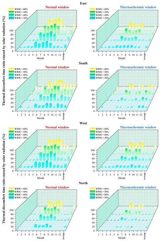 The thermal discomfort time ratios caused by solar radiation with normal windows and thermochromic windows under different WWRs.