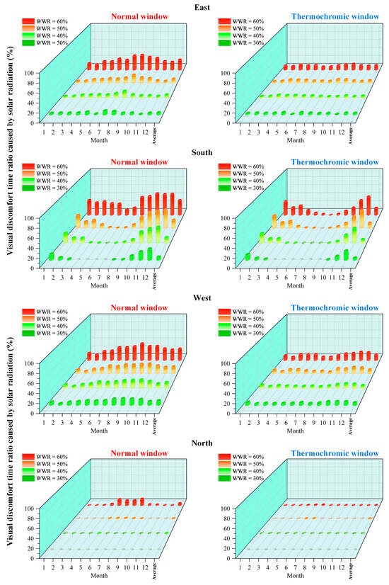 The visual discomfort time ratios caused by solar radiation with normal windows and thermochromic windows under different window-to-wall ratios.