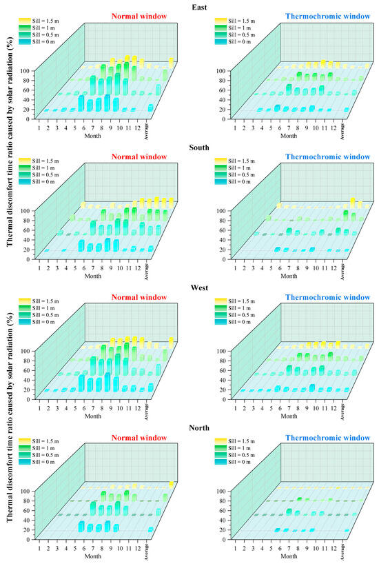 The thermal discomfort time ratios caused by solar radiation with normal windows and thermochromic windows under different sill heights.