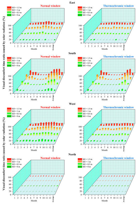 Figure 12 shows the visual discomfort time ratios with two types of windows under different sill heights when the WWR is fixed at 40%. It can be seen that as the sill height increases, the annual visual discomfort time ratio caused by solar radiation under all window orientations first increases and then decreases, while the ability of thermochromic windows to improve visual comfort decreases. Specifically, for normal windows in the east orientation, as the sill heights are 0, 0.5, 1.0, and 1.5 m, the annual thermal discomfort time ratios are 0.7%, 5.9%, 12.0%, and 11.0%, respectively, while those with thermochromic windows are 0.4%, 4.2%, 9.6%, and 9.2%, respectively, and the corresponding reductions in visual discomfort duration by thermochromic windows are 42.5%, 29.7%, 19.9%, and 15.9%, respectively. For normal windows in the south orientation, the annual thermal discomfort time ratios are 2.5%, 10.3%, 19.2%, and 17.4%, respectively, while those with thermochromic windows are 1.2%, 7.0%, 14.3%, and 13.2%, respectively, and the corresponding reductions in visual discomfort duration by thermochromic windows are 49.9%, 32.6%, 25.6%, and 24.2%, respectively. For normal windows in the west orientation, the annual thermal discomfort time ratios are 5.0%, 11.3%, 16.8%, and 15.7%, respectively, while those with thermochromic windows are 1.5%, 6.2%, 11.9%, and 12.0%, respectively, and the corresponding reductions in visual discomfort duration by thermochromic windows are 70.1%, 45.1%, 29.3%, and 23.4%, respectively. Meanwhile, no significant visual discomfort is observed for the north window.