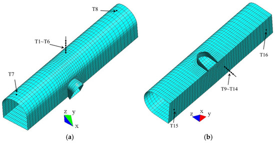 To facilitate the analysis of results, a series of characteristic points were selected in the 733 gallery of Dam Section 7#. Specifically, points T1 to T6 are located at the middle of the vault, with distances of 0 cm, 30 cm, 60 cm, 90 cm, 120 cm, and 160 cm from the vault surface, respectively. Point T7 is situated at the right end of the gallery in this dam section. Point T8 is located at the left end near the left bank. Points T9 to T14 are positioned beneath the floor slab, with distances of 0 cm, 30 cm, 70 cm, 90 cm, 120 cm, and 160 cm from the floor slab surface, respectively. Point T15 is at the right end of the gallery in this dam section, and point T16 is at the left end. The specific locations of these characteristic points are illustrated in Figure 3.
