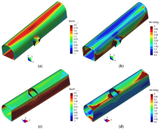 Envelope diagram of the first principal stress σ1 and minimum crack resistance safety factor for the vault and floor slab. (a) Envelope diagram of the first principal stress σ1 (Unit: MPa); (b) Minimum crack-resistance safety factor; (c) Envelope diagram of the first principal stress σ1 (Unit: MPa); (d) Minimum crack-resistance safety factor.