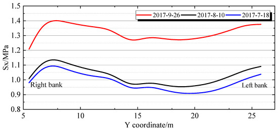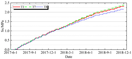 Regarding the temporal variation characteristics of the hoop stress at the floor, the development history of the hoop σx stress at point T9 on the surface of the gallery floor is illustrated in Figure 11. The pattern of its temporal development is generally consistent with that of the stress at the vault surface. The key difference lies in the period from February to July 2018, after the completion of arch closure, when the stress at the gallery floor surface gradually increased under the combined effects of temperature and the self-weight of the upper concrete. After August 2018, as the air temperature inside the gallery began to gradually decrease, the stress at the floor surface rapidly increased, reaching 2.17 MPa by 2 December 2018.