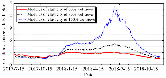 In the temperature and stress simulation calculations during the construction period, the impacts of the differences in mechanical properties between wet-screened and fully graded concretes are primarily reflected in two aspects: elastic modulus and strength. Figure 32 and Figure 33 depict the stress history on the vault and floor surfaces of the gallery under scenarios using 100%, 80%, and 60% of the wet-screened concrete’s elastic modulus, respectively. Before the mid-term cooling phase, the pouring elevation of the dam body is relatively low, and the influence of self-weight is minor. Consequently, the hoop stresses on the vault and floor surfaces of the gallery are mainly induced by temperature effects. Therefore, when considering the differences in material mechanical properties, a reduction in elastic modulus leads to a corresponding decrease in stress. After the arch closure grouting, as the pouring elevation of the dam body increases, the self-weight of the upper concrete becomes the primary factor inducing hoop tensile stresses on the vault and floor surfaces. Since the hoop stresses caused by self-weight are minimally affected by the concrete’s elastic modulus, the compressive stresses generated by the increase in air temperature inside the gallery after arch closure also decrease due to the reduced elastic modulus. Consequently, after considering both factors, the hoop stresses on the vault and floor of the gallery increase with the reduction in elastic modulus after grouting.