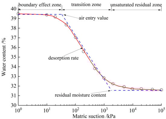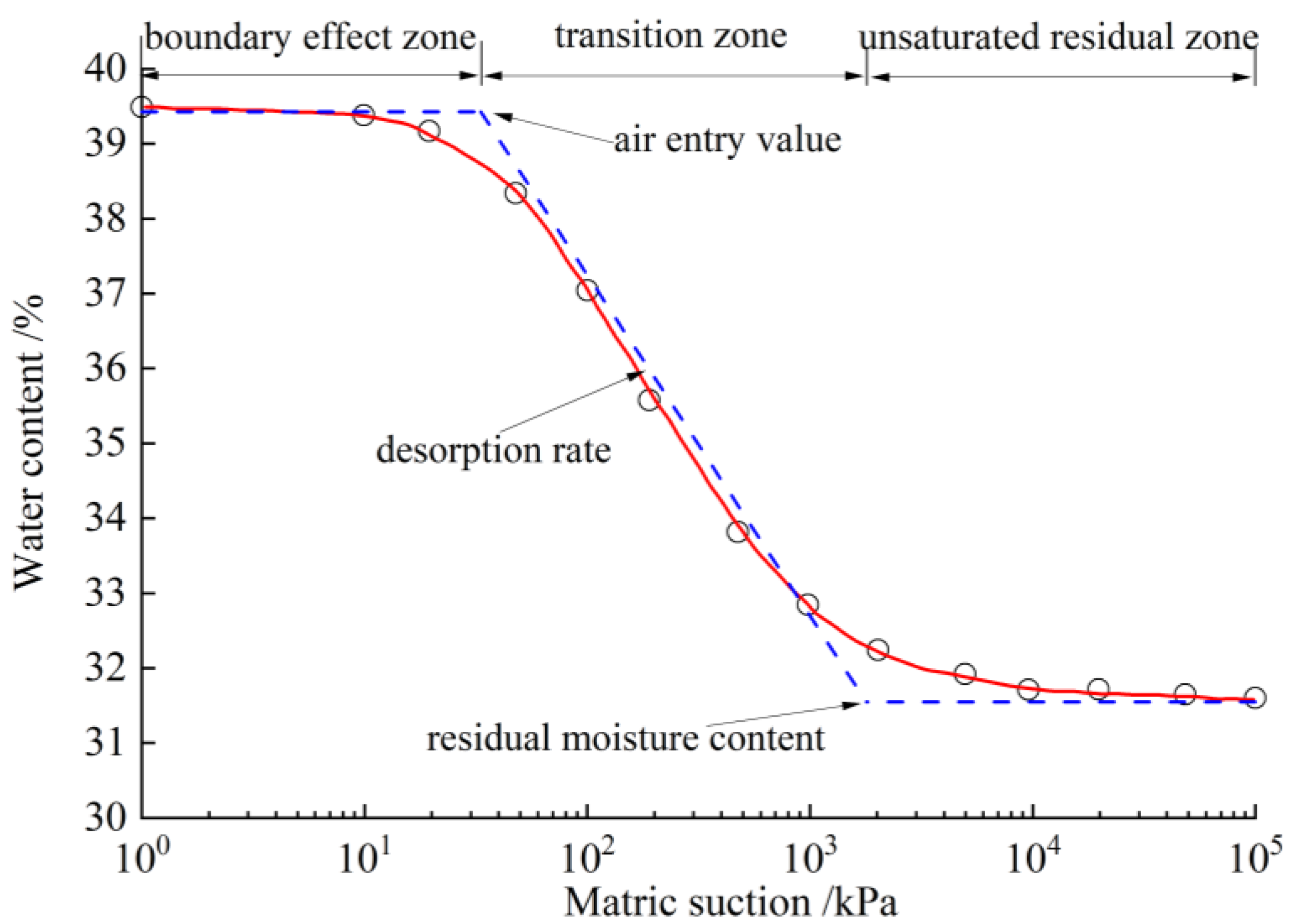 The soil water characteristic curve (SWCC) is a curve that describes the relationship between suction and saturation or water content in unsaturated soil, and it is also a key function used to describe the microscopic connections between different phases of unsaturated soil [1]. It can be used to quantitatively analyze the characteristics of interaction between water and air in unsaturated soil and then study the strength, hydraulic conductivity, and deformation of unsaturated soil [2,3]. In general, suction increases with decreasing saturation, and the shape of the SWCC varies for different types of soil. The SWCC is generally represented in semi-logarithmic coordinates and can be roughly divided into three regions—the boundary effect zone, transition zone, and unsaturated residual zone [4,5] as shown in Figure 1. Taking the drying process as an example, the matric suction in the capillary zone starts from 0 and reaches the air entry value, indicating the beginning of the drying process. The air entry value can be taken as the intersection of the horizontal line at saturation and the slope of the curve. As the drying process progresses, the suction is already at a high value near the residual moisture content. Further drainage is then impossible.