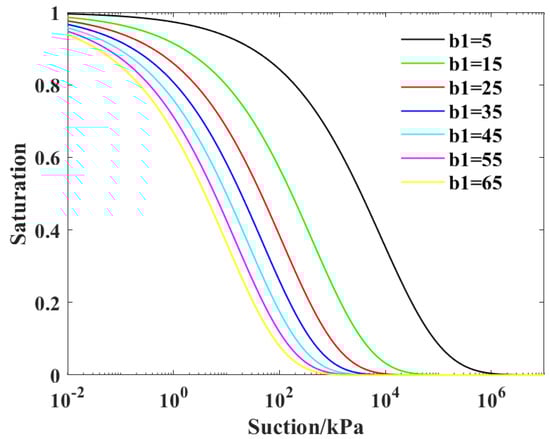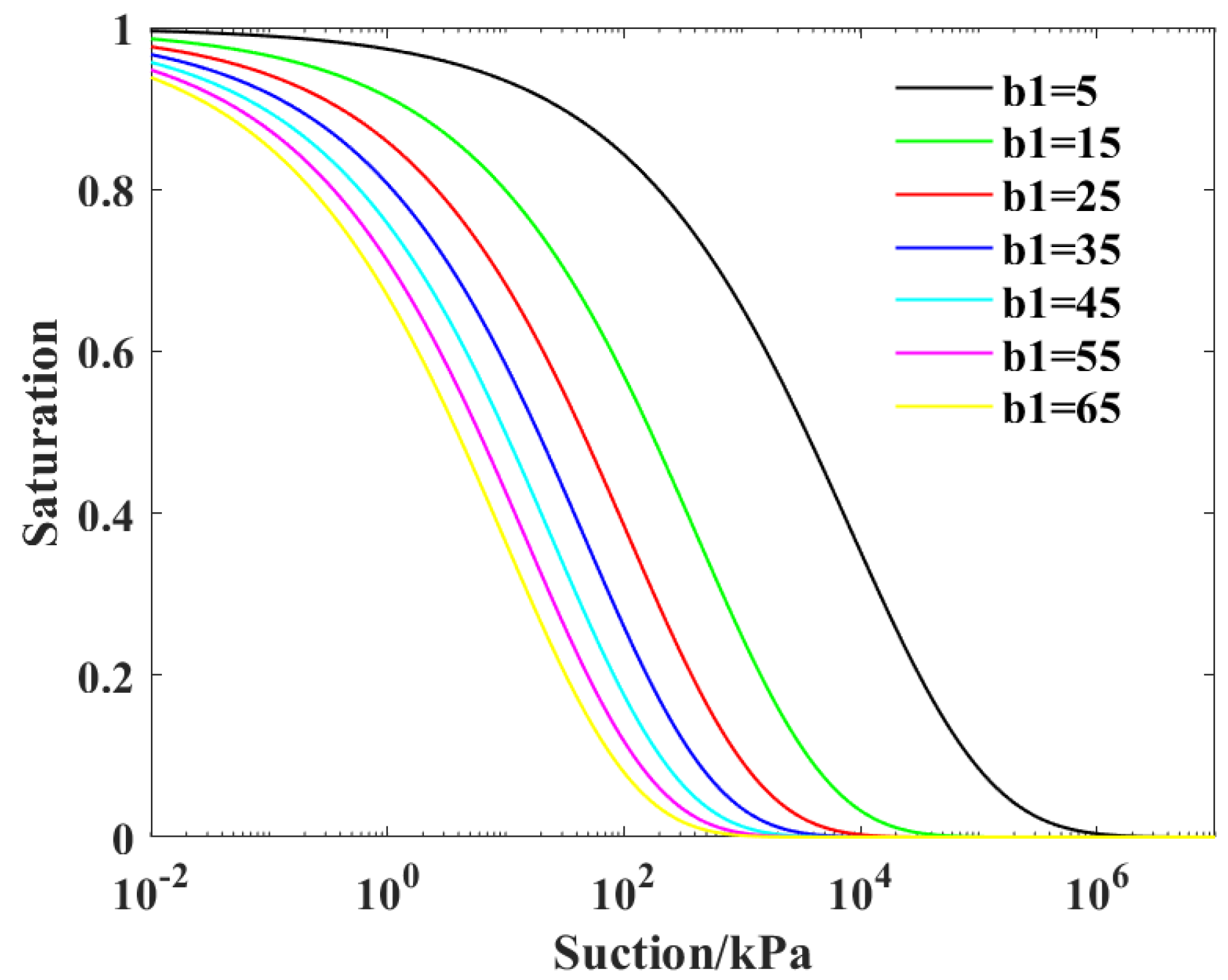 Under the condition that other parameter values remain unchanged, b1 takes seven different values in the range of 5–65, and the SWCC changes can be observed, as shown in Figure 3. It can be seen that with the increase in the b1 value, the air entry value gradually decreases, the slope of the curve in the transition section increases slightly, and the curve as a whole shifts to the left. Moreover, the plot is more sensitive to changes in b1 when these values are small.
