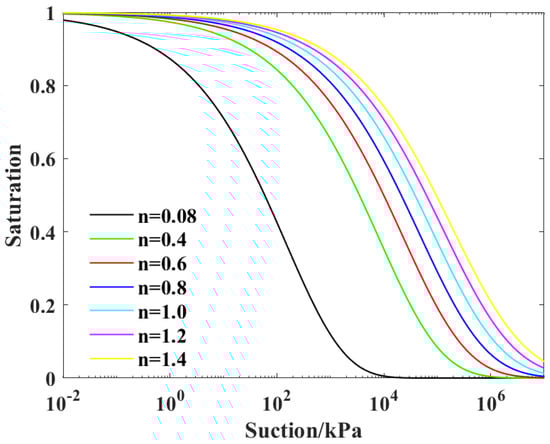 Similarly, n takes seven different values in the range of 0.08–1.4, and the SWCC changes can be observed, as shown in Figure 4. With the increase in the n value, the air entry value increases gradually, the slope of SWCC transition section decreases slightly, and the curve moves to the right as a whole. A small change in the n value has a significant impact on SWCC.