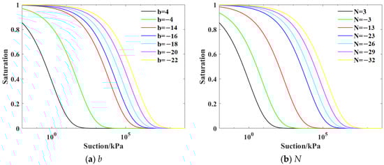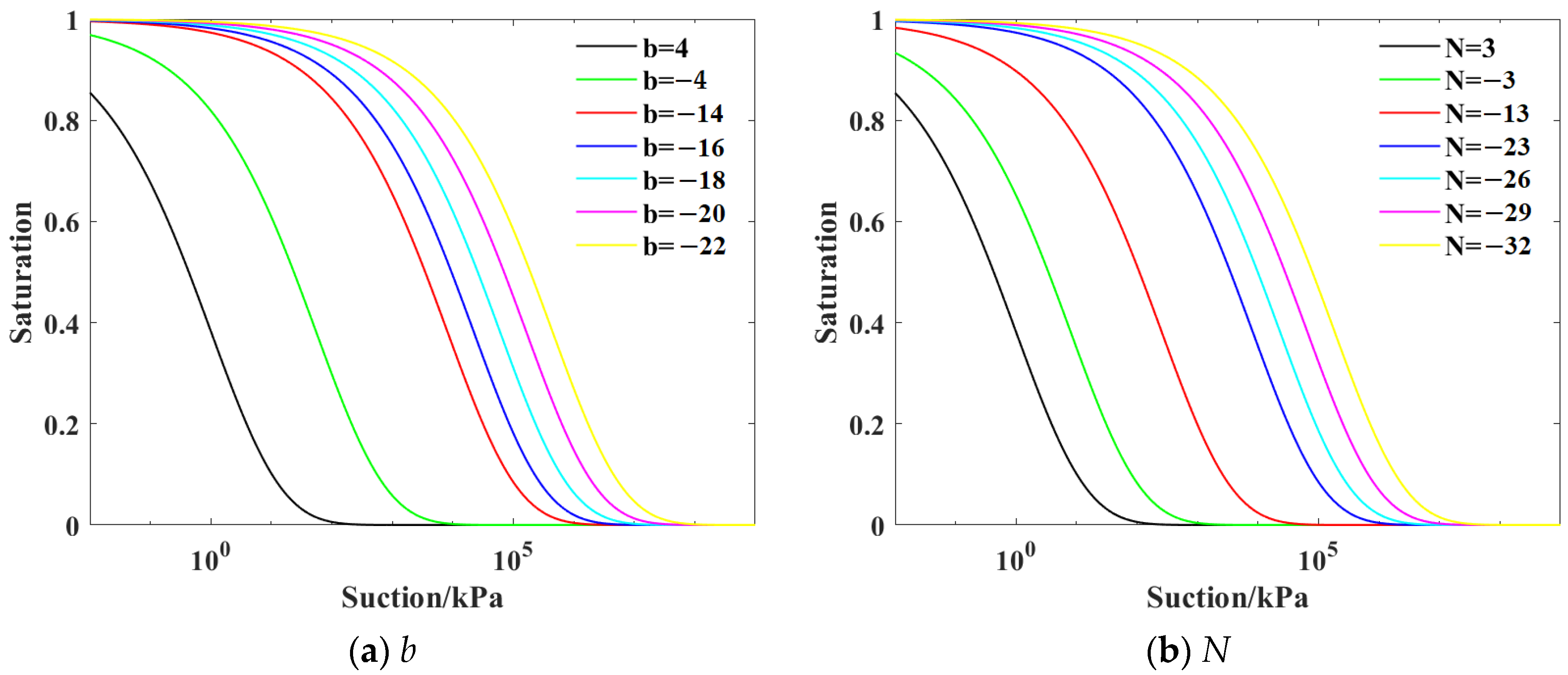 b and N are parameters related to salinity. The variation of SWCC with the two values is shown in Figure 5. It can be seen from the figure that small parameter changes will have a greater impact on SWCC. The values of parameters b and N are mainly negative, and with the increase in b and N, the air entry value gradually decreases, and SWCC moves to the left.