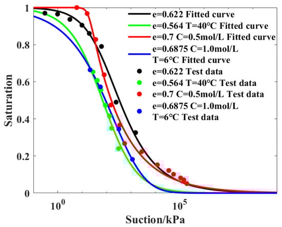 In order to verify the effectiveness of the proposed SWCC model (Equation (6)) considering the influence of multiple factors, four representative experimental datasets were used to validate the fitting ability of the model. The first test dataset only considers the influence of void ratio (e = 0.622, T = 22 °C, C = 0; Jacinto et al. 2009 [38]); then, Equation (6) can be simplified to the form of Equation (3). The second test dataset considers the effects of temperature and void ratio (e = 0.564, T = 40 °C, C = 0; Jacinto et al. 2009 [38]), and Equation (6) can be simplified as