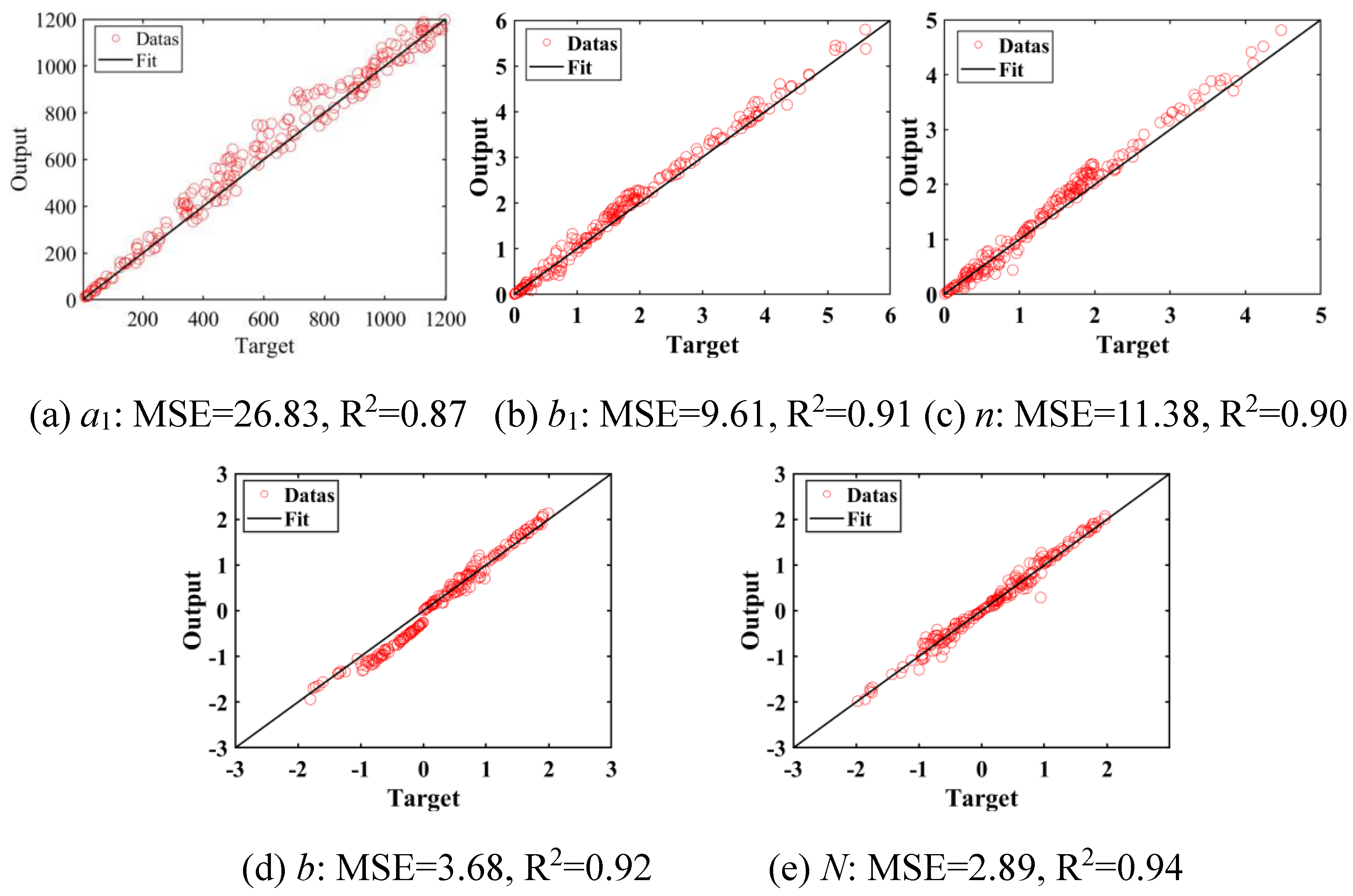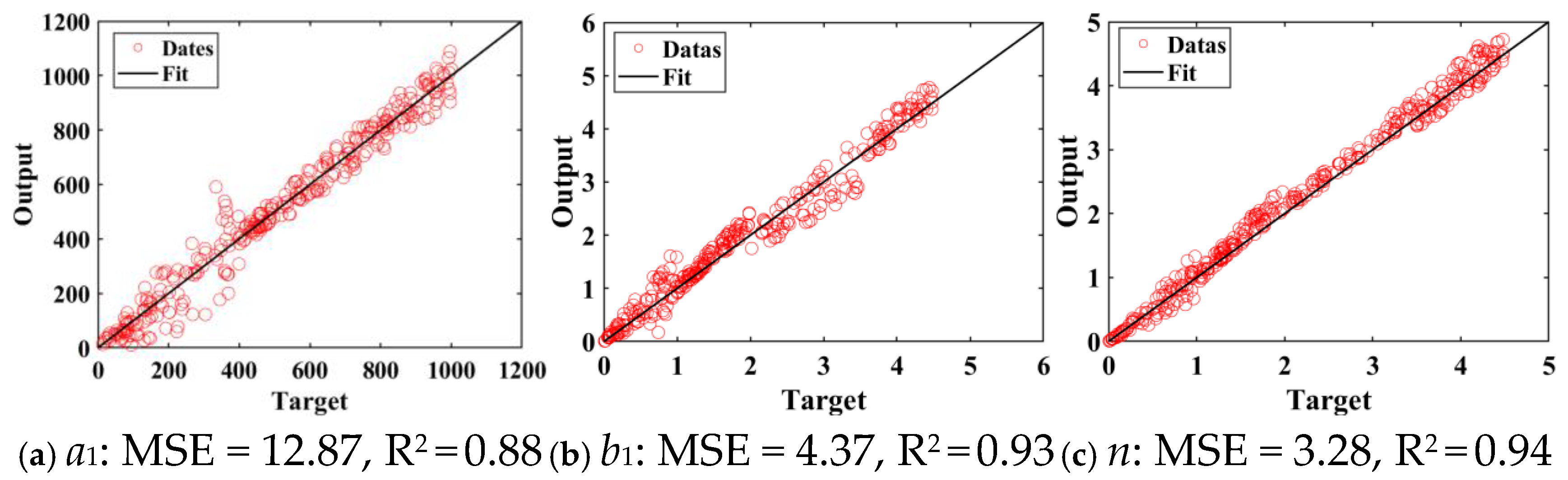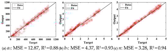 Without considering the effect of salinity, the SWCC model only contains three parameters a1, b1 and n, and the number of output nodes of machine learning prediction is 3. The accuracy and reliability of the prediction model were tested by calculating the correlation coefficient (R2), mean square error (MSE), mean absolute error (MAE), and root mean square error (RMSE). The smaller the MSE value and the closer the R2 value is to 1, the stronger the prediction ability of the model is. The training results are shown in Figure 8, which show good prediction accuracy.