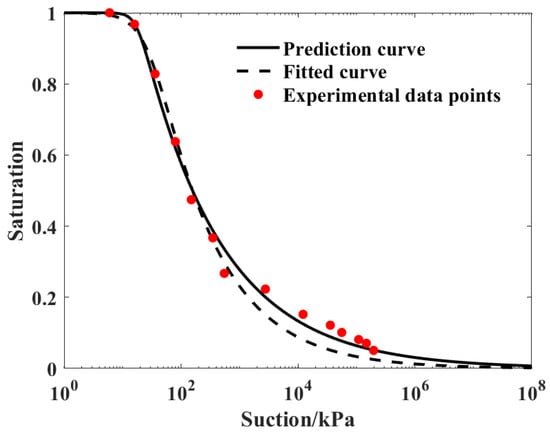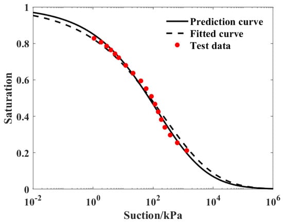 SWCC test data considering the effect of salinity were selected to verify the prediction model, as shown in Figure 14. The prediction results are basically consistent with the fitting effect of the model, being even better than the fitting curve; this means they are well matched with the test data.