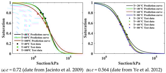 Based on the prediction model, the SWCC model parameters of two soils with initial void ratios of 0.72 and 0.564 under different temperature conditions were predicted, and the prediction results are shown in Figure 12. It can be seen that the prediction results are in good agreement with the test data, indicating that the proposed model parameter prediction method has a good prediction effect for the SWCC, considering the effects of temperature and void ratio.