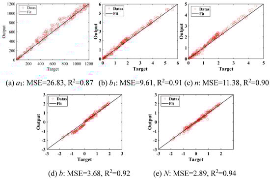 When considering the effect of salinity, the model has five parameters to be calibrated, which are a1, b1, n, b, and N. Under this condition, the number of output nodes of machine learning is also 5. The SWCC test data related to salinity were trained by machine learning, and the training results are shown in Figure 13. Similarly, analogous to the scenario without salinity, 10-fold cross-validation was also performed for the prediction of five parameters for the scenario with salinity, and the corresponding validation results are presented in Table 4.