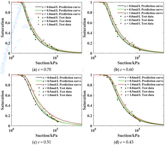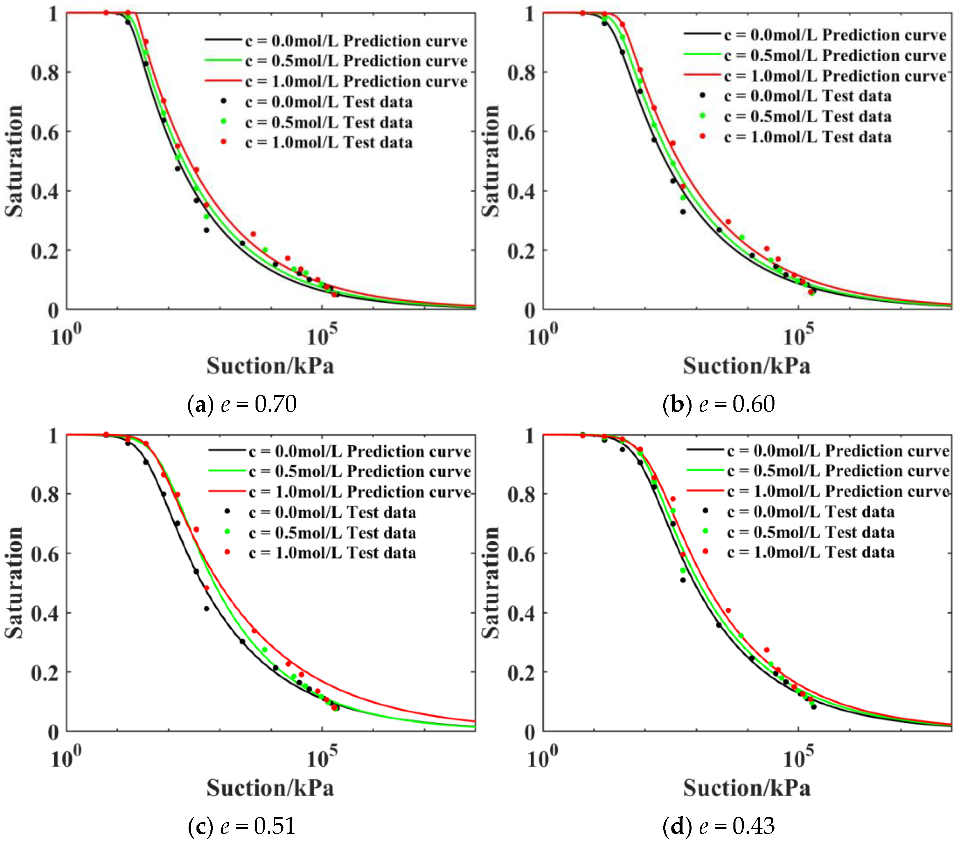 In addition, the change characteristics of SWCC with different salinity and void ratio were predicted, and the results are shown in Figure 15. It can be seen that the prediction results are consistent with the test data, which also verifies the prediction ability of the prediction model for SWCC model parameters considering the effect of salinity.