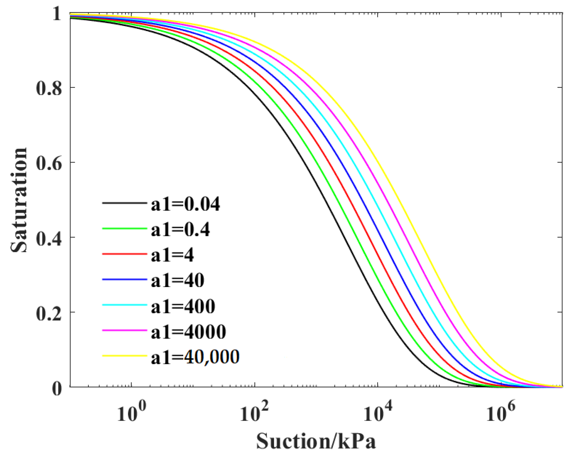 Under the condition that other parameter values remain unchanged, a1 takes seven values of different orders of magnitude from the range of 0.04–40,000, and the change in the SWCC can be observed, as shown in Figure 2. It can be seen that with the increase in a1, the air entry value gradually increases, and in the saturation (sr)-suction (s) coordinate plane, the SWCC as a whole shifts to the right. However, although the value of a1 changes significantly, the impact on SWCC is relatively small.