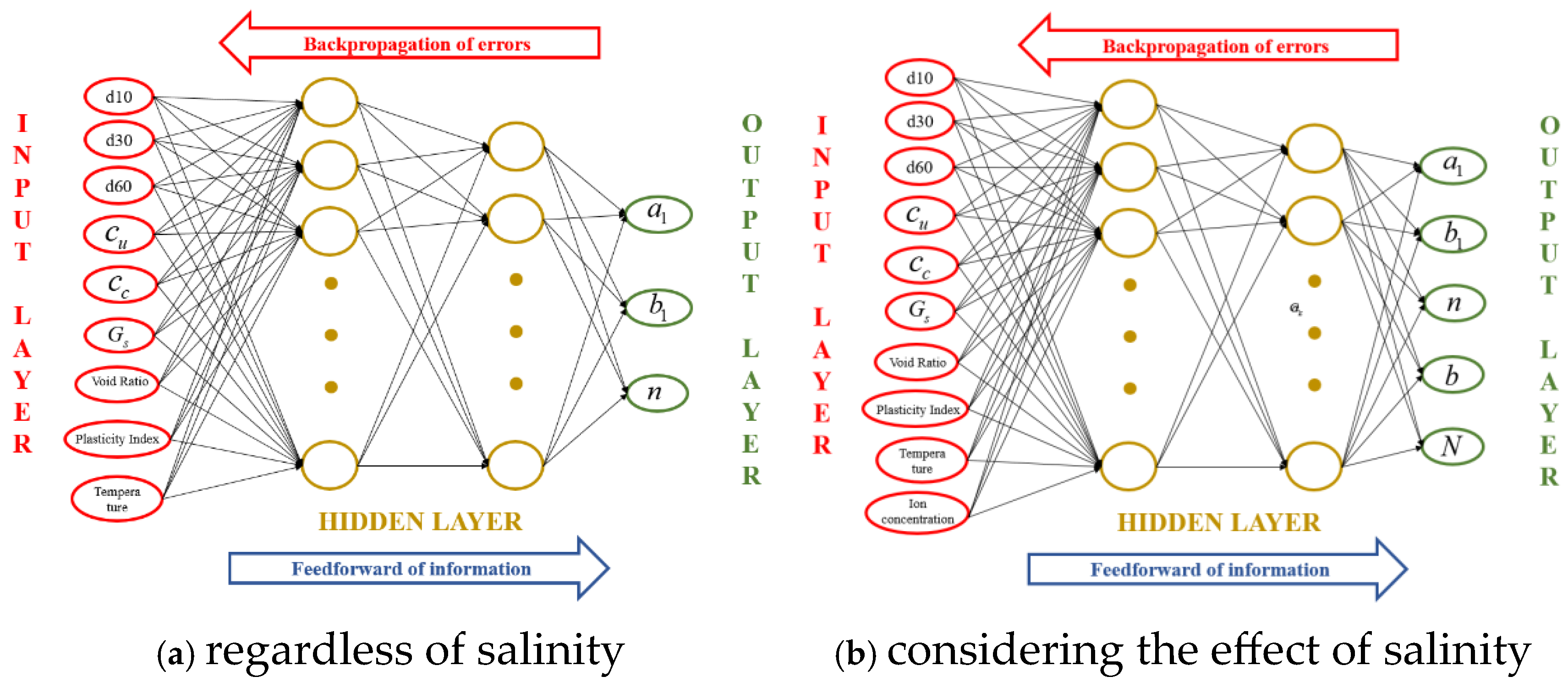Based on the current literature, there is a wealth of research on the SWCC taking into account factors such as void ratio, temperature, and salinity. However, most of these discussions are conducted from a single-factor perspective, and there are relatively few research reports on the coupling effect of void ratio, temperature, and salinity on the SWCC; there is a particular lack of research on the primary and secondary positions of different influencing factors. Moreover, although corresponding fitting equations have been established for describing SWCC, obtaining SWCC through experiments and curve fitting creates both time-consuming and uneconomical issues. Therefore, some scholars have attempted to use data mining methods to construct SWCC prediction models based on machine learning methods, thereby transforming the determination of SWCC into a simple problem of obtaining soil parameters and environmental factors [25,26,27]. Several models have been developed for predicting the SWCC. Artificial neural networks (ANNs), which are machine learning systems based on biological neural networks, are among the techniques used for SWCC prediction [28,29]. Da Silva et al. (2023) [30] analyzed the main machine learning algorithms used to build a pedotransfer function and found that ANNs had a large advantage over other methods. Pereira et al. (2025) [31] have even provided a detailed account of the challenges faced by ANNs in SWCC prediction, thereby offering a reference for future research. However, little work has been carried out on SWCC prediction under the influence of factor coupling. On the one hand, this may be due to the limited amount of involved experimental data; on the other hand, there are no suitable models that reflect soil–water characteristics under the influence of multiple factors.