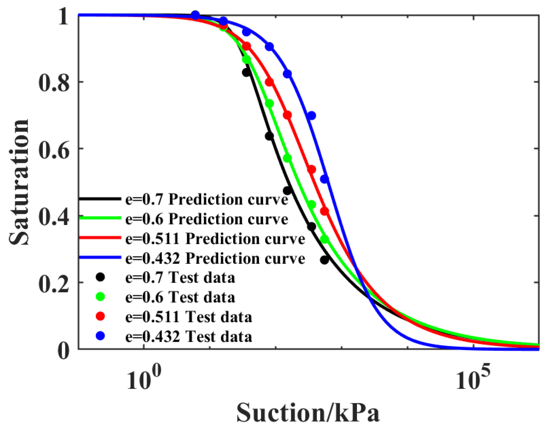 The trained model was used to predict the change in SWCC under different void ratios, as shown in Figure 10, and it accurately predicted the characteristics of the variation of SWCC with void ratio.