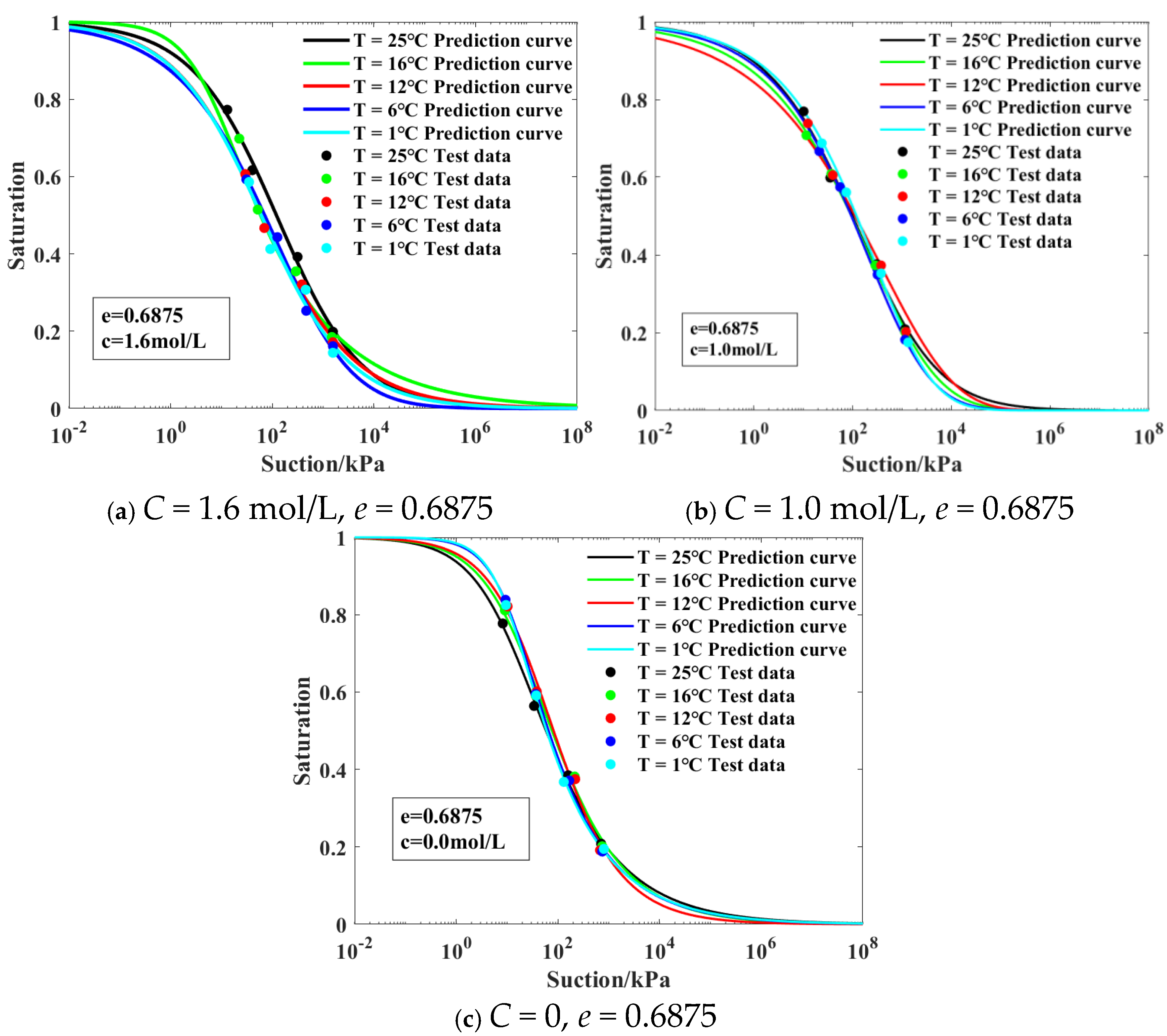 Equation (6) is the SWCC model that considers the effects of deformation, temperature, and salinity simultaneously, including six model parameters. The proposed model is indeed an empirical engineering framework designed for practical SWCC prediction under multi-factor influences, rather than a fully derived thermodynamic constitutive model. Its primary contribution lies in the integration of well-established single-factor mechanisms into a unified, usable vG model framework. The selection of each term is grounded in recognized physical mechanisms.