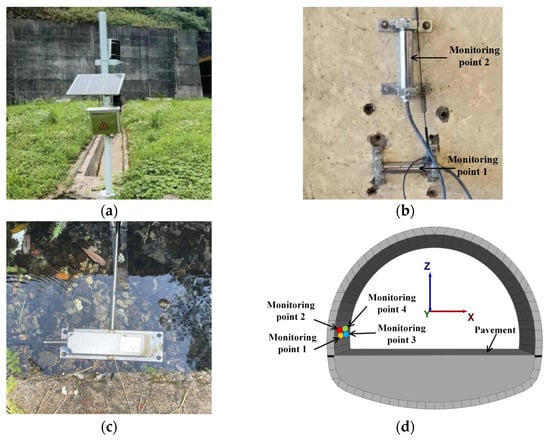 Therefore, this study selects K97+350 and K97+375 as typical monitoring sections. By integrating the topography and tunnel lining structure, a monitoring system is designed to record the influence of rainfall, drainage, and other factors on the stress and deformation of the lining structure, forming a comprehensive monitoring network that links hydrological and structural responses. The monitoring system at the tunnel site includes an automatic rain gauge, Doppler ultrasonic flow velocity sensors, and vibrating wire strain gauges (rain gauge measurement range: 0–4 mm/min, resolution: 0.01 mm, calibration frequency: every two months, sampling frequency: 30 min; flow sensor resolution: 0.001 m3/s, calibration frequency: every two months, sampling frequency: 30 min; vibrating wire strain gauge measurement range: 1000 με, accuracy ≤ 0.5%F·S, sampling frequency: 16 min). These sensors monitor rainfall, drainage, and strain on the lining structure. The locations of the monitoring points are shown in Figure 1. In Figure 1d, monitoring points are arranged at two key locations on the lining structure (sidewalls), with measurements in the Y direction (Monitoring points 1 and 3) and Z direction (Monitoring points 2 and 4). The Y direction represents the tunnel axis direction (longitudinal), and the Z direction represents the vertical direction parallel to the sidewall (vertical).