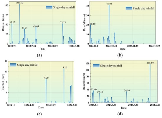 Daily rainfall at the tunnel Site. The four quarters of rainfall during the monitoring period were (a) the third quarter of 2023, (b) the fourth quarter of 2023, (c) the first quarter of 2024, and (d) the second quarter of 2024.