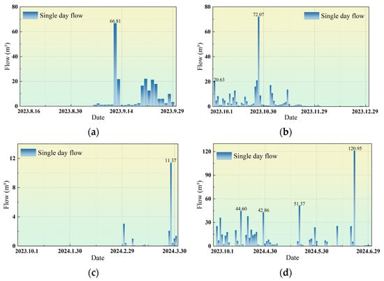 Daily Flow at the Tunnel Site. The four quarters of water discharge during the monitoring period were (a) the third quarter of 2023, (b) the fourth quarter of 2023, (c) the first quarter of 2024, and (d) the second quarter of 2024.