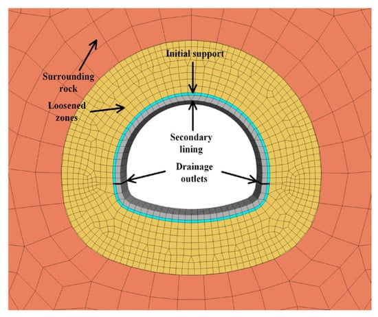The tunnel’s 3D geometry model is constructed based on the actual engineering dimensions and shape. The tunnel is excavated using the bench method, with the details shown in Figure 6. Specifically, the tunnel cross-section has a net width of 10.82 m, net height of 7.09 m, and a cross-sectional area of 63.85 m2, with a tunnel body dimension of 3 m. The secondary lining, initial support, drainage outlets, and surrounding rock (loosened and non-loosened zones) are set as different layers in the model. The drainage outlet is idealized during modeling, with a permeability coefficient of 9 × 10−2 m/s. For mesh discretization, the surrounding rock region uses a grid size of 2 m, while key areas such as near the lining and the loosened zones are refined using a 0.5 m grid, resulting in a total of 12,588 elements. The surrounding rock consists primarily of moderately weathered sandstone, with occasional intercalated carbonaceous shale layers. The structure is fragmented, and joints are well-developed. The geological survey report from the early stages of the project provides measured and estimated values for the natural density, elastic modulus, Poisson’s ratio, and permeability coefficient of the major soil and rock media. Further values are determined by referencing data from the literature []. Due to the lack of field data covering all the simulation requirements, certain parameters, such as shear strength indicators (cohesion c and internal friction angle φ) and hydraulic modulus, refer to the typical recommended values in the “Highway Tunnel Design Code” (JTG 3370.1-2018) [] and “Geotechnical Engineering Investigation Code” (GB 50021-2001) []. The mechanical and fluid parameters for the model are shown in Table 2 and Table 3.