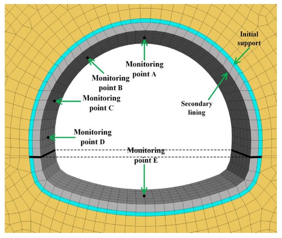 To accurately assess the impact of heavy rainfall on tunnel lining, the first step is to analyze the rainfall intensity and duration conditions. Rainfall intensities of 20 mm/h, 30 mm/h, 40 mm/h, 60 mm/h, and 80 mm/h are converted into simulation software units as 5.56 × 10−6 m/s, 8.33 × 10−6 m/s, 1.11 × 10−5 m/s, 1.67 × 10−5 m/s, and 2.22 × 10−5 m/s, respectively (conversion formula: 1 mm/h = 1 × 10−3 m/3600 s = 2.78 × 10−7 m/s). The final step is to analyze the permeability conditions of the surrounding rock in the loosened zone under heavy rainfall conditions (see Table 4). Multiple monitoring points are set up in the FLAC3D model to monitor real-time changes in lining water pressure, stress, and displacement. The specific monitoring points include Point A in the crown area, Point B in the waist area, Point C in the foot area, Point D in the sidewall area, and Point E in the invert area (as shown in Figure 7), with the dashed line indicating the approximate position of the road surface. Due to the symmetry of the tunnel model, monitoring points are only placed on one half of the tunnel.