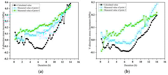 Comparison diagram of stress increment between calculated value and measured value. The comparison figures are (a) Z direction and (b) Y direction.