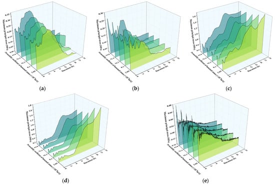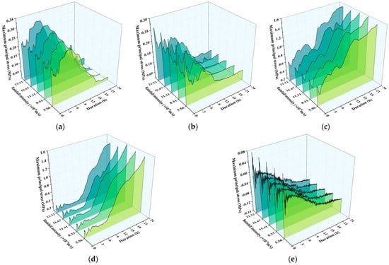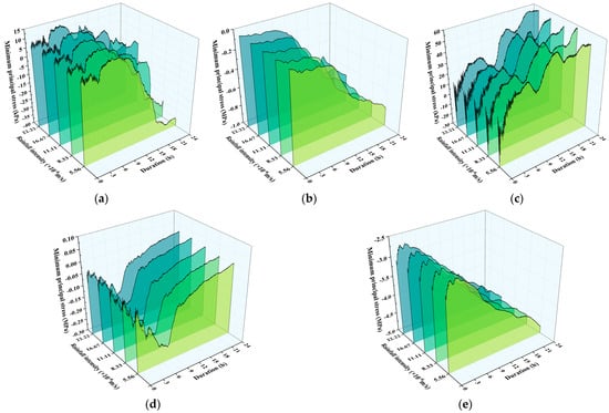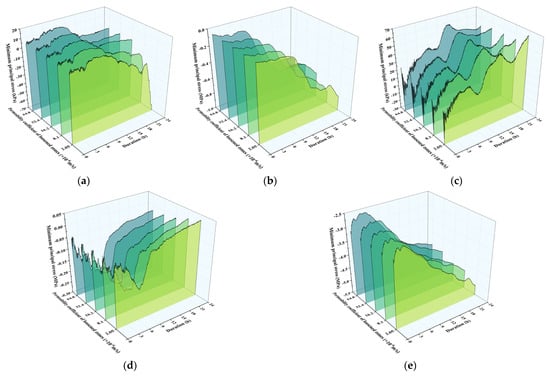 Figure 13a–e show the impact of rainfall duration on the minimum principal stress increment in the tunnel lining. At Monitoring point A, the minimum principal stress increment first increases briefly and then drops sharply, showing that tensile stress increases to a peak before gradually decreasing and transforming into compressive stress after about 18 h. The increment at Monitoring point B shows a nonlinear decreasing trend, indicating that compressive stress gradually increases. The maximum increment is 1.4 Mpa (corresponding to compressive stress of 1.43 Mpa), which has minimal impact on the structure. At Monitoring point C, the increment gradually rises, with tensile stress continuing to increase. At Monitoring point D, the increment decreases briefly and then gradually increases, with compressive stress first increasing and then decreasing. The changes at Monitoring points C and D are both small, and their impact is limited. At Monitoring point E, the increment gradually decreases, with compressive stress decreasing in the first 7 h and then gradually increasing after 7 h. The maximum increment reaches 3.31 Mpa (corresponding to compressive stress of 6.3 Mpa). Compared to the design compressive strength value of 14.3 Mpa for C30 concrete, 6.3 Mpa is far below this value; so, there is no risk of crushing. The 7 h mark may be the critical duration for base softening, where prolonged soaking causes a significant reduction in the elastic modulus of the base soil, and the load continues to transfer to the lining. Prolonged rainfall significantly increases compressive stress in the crown arch area. It is recommended to activate emergency drainage pumps during heavy rainfall to control the base softening process and reduce stress accumulation.