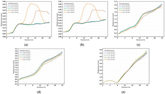 The change in the displacement of each monitoring point in different heavy rainfall intensity. Each monitoring point is (a) measuring point A, (b) measuring point B, (c) measuring point C, (d) measuring point D, (e) measuring point E.