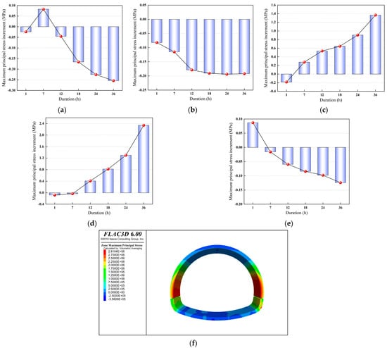 Impact of Rainfall Duration on the Maximum Principal Stress Increment at Each Monitoring Point and the Principal Stress Contour Map. (a) measuring point A, (b) measuring point B, (c) measuring point C, (d) measuring point D, (e) measuring point E. (f) Maximum Principal Stress Contour Map.