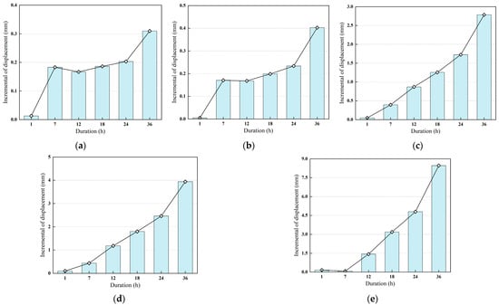 The influence of rainfall duration on the displacement increment in each monitoring point. Each monitoring point is (a) measuring point A, (b) measuring point B, (c) measuring point C, (d) measuring point D, (e) measuring point E.