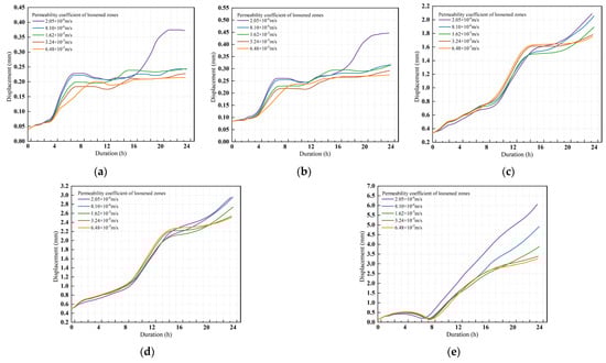 Figure 17a–e show the displacement time-history variations at typical tunnel locations under different permeability coefficients of the loosened zone. When the permeability coefficient ranges from 8.1 × 10−6 to 6.48 × 10−5 m/s, the displacement at Monitoring points A and B rapidly increases in the early stage of rainfall and then gradually stabilizes, showing a “rapid increase-slow increase” characteristic. Under low permeability conditions (2.05 × 10−6 m/s), the displacement shows a sudden increase during the stable phase corresponding to other permeability coefficients, but the maximum value only reaches 0.45 mm, indicating minimal impact. At Monitoring points C, D, and E, the displacement shows nonlinear growth under all permeability coefficients. Under high permeability conditions (6.48 × 10−5 m/s), the displacement at Monitoring points D and E is most significant at the 24 h mark, with increments of 2 mm and 3.12 mm before and after rainfall, respectively. Compared to low permeability surrounding rock, the decrement in the increment is 18% and 33%, indicating that the bottom structure responds most strongly to changes in the permeability of the surrounding rock. This suggests that high permeability allows rainwater to quickly infiltrate the surrounding rock, preventing the formation of significant pore water pressure differences. This effectively reduces the hydraulic gradient and minimizes the lateral pushing force on the lining. Additionally, it prevents a sudden rise in the groundwater level, reducing the concentrated effect of uplift pressure on the base, thereby reducing displacement. As the permeability of the surrounding rock increases, the displacement growth trend significantly slows, indicating that high permeability surrounding rock helps alleviate water pressure accumulation and reduces the rate of structural deformation.