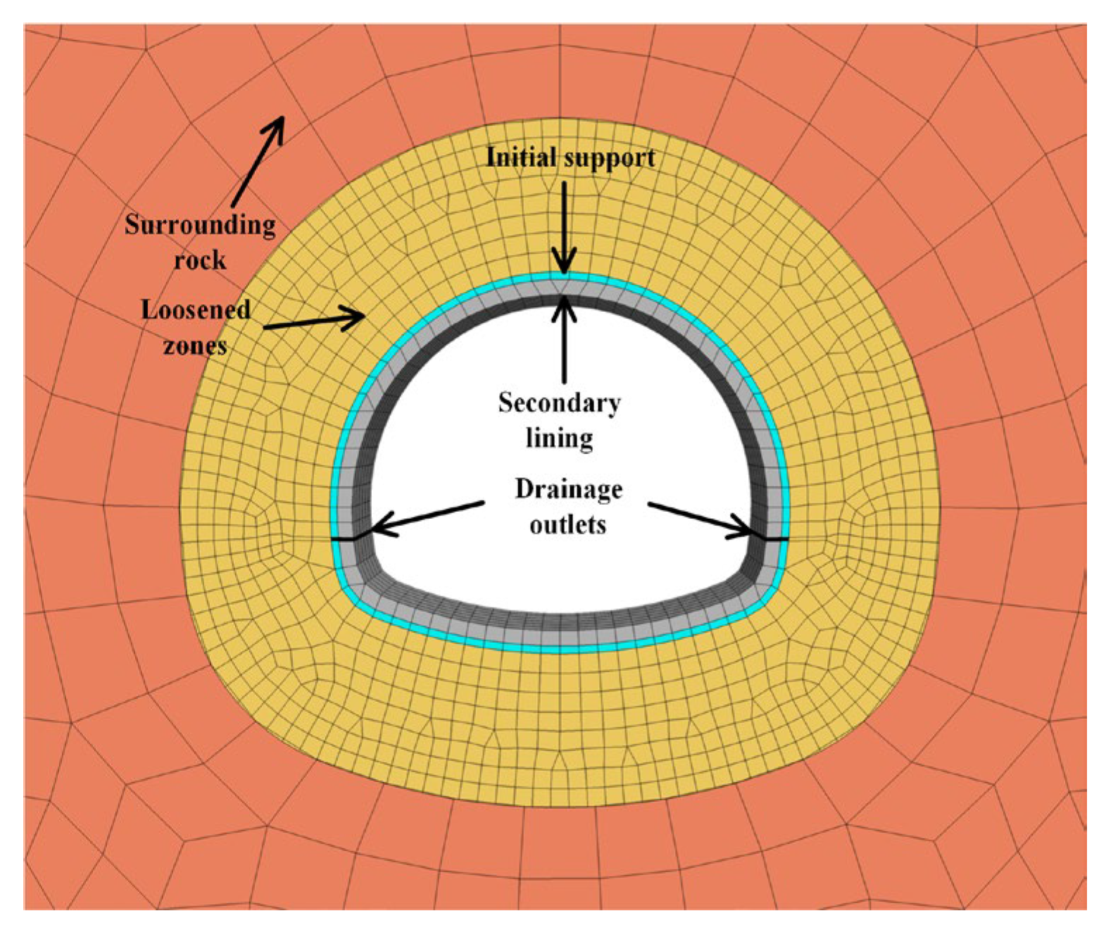 | Surrounding rock | 6.00 | 0.33 | 2300 | 35.00 | 0.80 | 0.30 |