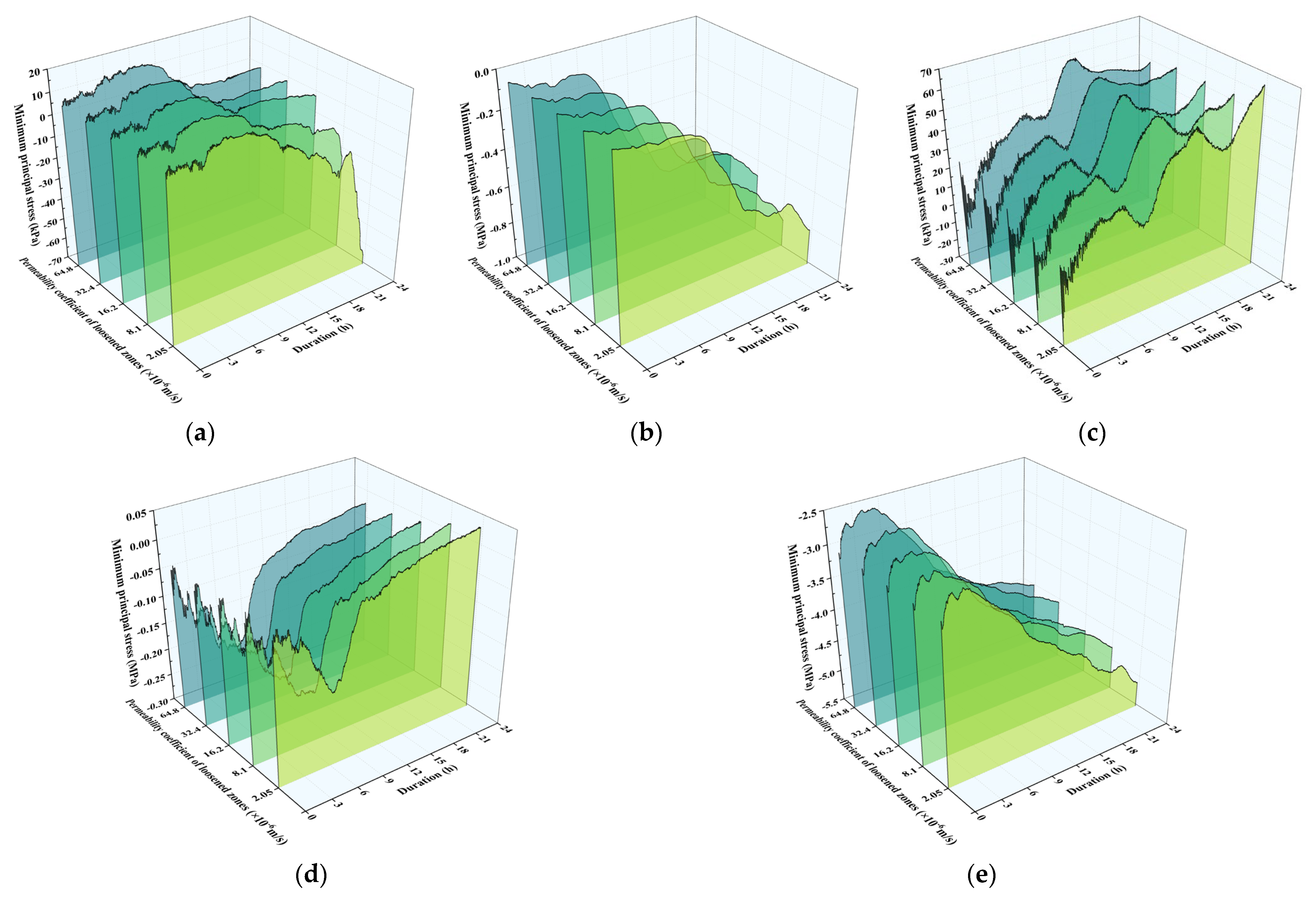 5.1. Effects of Permeability Coefficient in Loosened Zones on Stress Response Characteristics of Secondary Linings