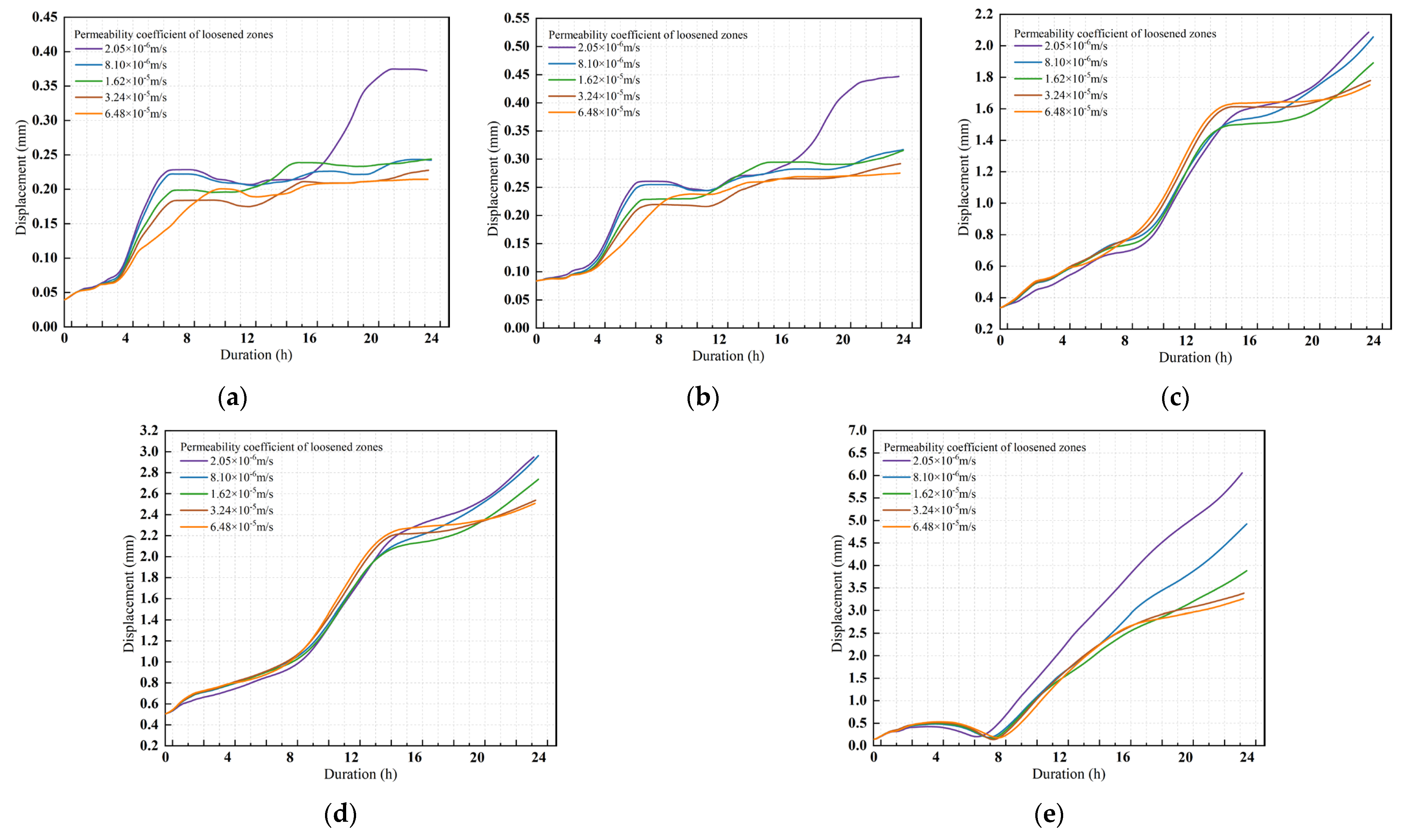 5.2. Effects of Permeability Coefficients in Loosened Zones on Displacements of Secondary Linings