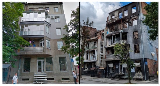 Kharkiv residential building, Myronosytska 32—original state (left) photo: source Google Street View) and the state after the destruction (right) photo made by Viktor Proskuryakov).